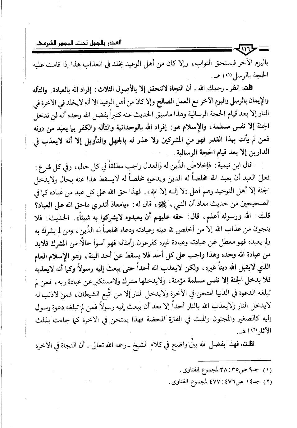 قلت: انظر -رحمك الله- أن النجاة لا تتحقق إلا بالأصول الثلاث: إفراد الله بالعبادة. والتأله والإيمان بالرسل واليوم الآخر مع العمل الصالح وإلا كان من أهل الوعيد إلا أنه لا يخلد في الآخرة في النار إلا بعد قيام الحجة الرسالية وهذا ما سبق الحديث عنه كثيراً بفضل الله وحده أنه لن تدخل الجنة إلا نفس مسلمة، والإسلام هو: إفراد الله بالوحدانية والتأله والكفر بما يعبد من دونه فمن لم يأت بهذا القدر فهو من المشركين ولا عذر له بالجهل والتأويل إلا أنه لا يعذب في الدارين إلا بعد قيام الحجة الرسالية.