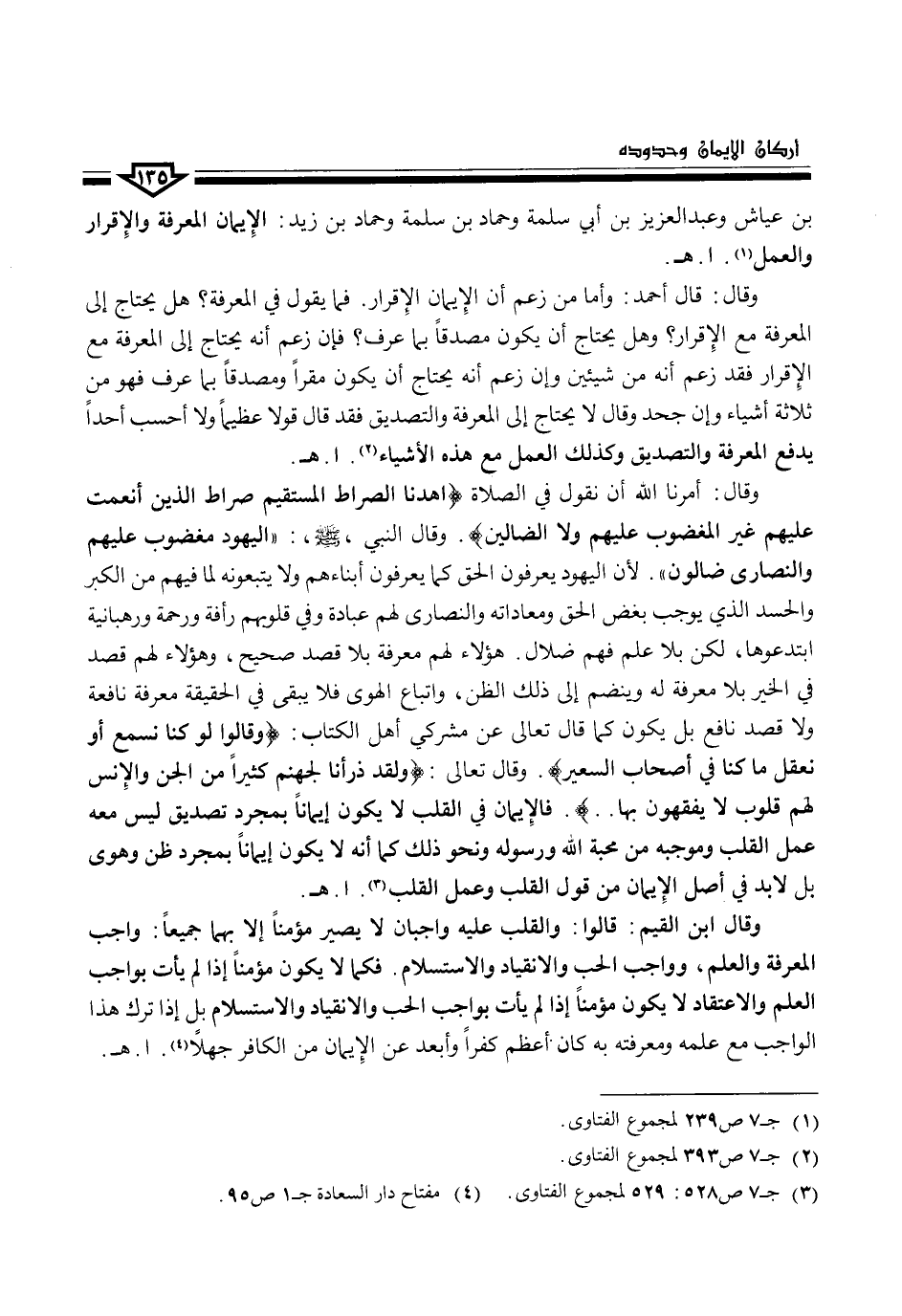 وقال: أمرنا الله أن نقول في الصلاة (اهدِنَا الصِّرَاطَ المُستَقِيمَ، صِرَاطَ الَّذِينَ أَنعَمتَ عَلَيهِمْ غَيرِ المَغضُوبِ عَلَيهِمْ وَلاَ الضَّالِّينَ). وقال النبي، صلى الله عليه وسلم، "اليهود مغضوب عليهم والنصارى ضالون". لأن اليهود يعرفون الحق كما يعرفون أبناءهم ولا يتبعونه لما فيهم من الكبر والحسد الذي يوجب بغض الحق ومعاداته والنصارى لهم عبادة وفي قلوبهم رأفة ورحمة ورهبانية ابتدعوها، لكن بلا علم فهم ضلال. هؤلاء لهم معرفة بلا قصد صحيح، وهؤلاء لهم قصد في الخبر بلا معرفة له وينضم إلى ذلك الظن، واتباع الهوى فلا يبقى في الحقيقة معرفة نافعة ولا قصد نافع بل يكون كما قال تعالى عن مشركي أهل الكتاب: (وَقَالُوا لَوْ كُنَّا نَسْمَعُ أَوْ نَعْقِلُ مَا كُنَّا فِي أَصْحَابِ السَّعِيرِ). وقال تعالى: (وَلَقَدْ ذَرَأْنَا لِجَهَنَّمَ كَثِيراً مِّنَ الْجِنِّ وَالإِنسِ لَهُمْ قُلُوبٌ لاَّ يَفْقَهُونَ بِهَا ..). فالإيمان في القلب لا يكون إيماناً بمجرد تصديق ليس معه عمل القلب وموجبه من محبة الله ورسوله ونحو ذلك كما أنه لا يكون إيماناً بمجرد ظن وهوى بل لا بد في أصل الإيمان من قول القلب وعمل القلب (¬3) ا. هـ.