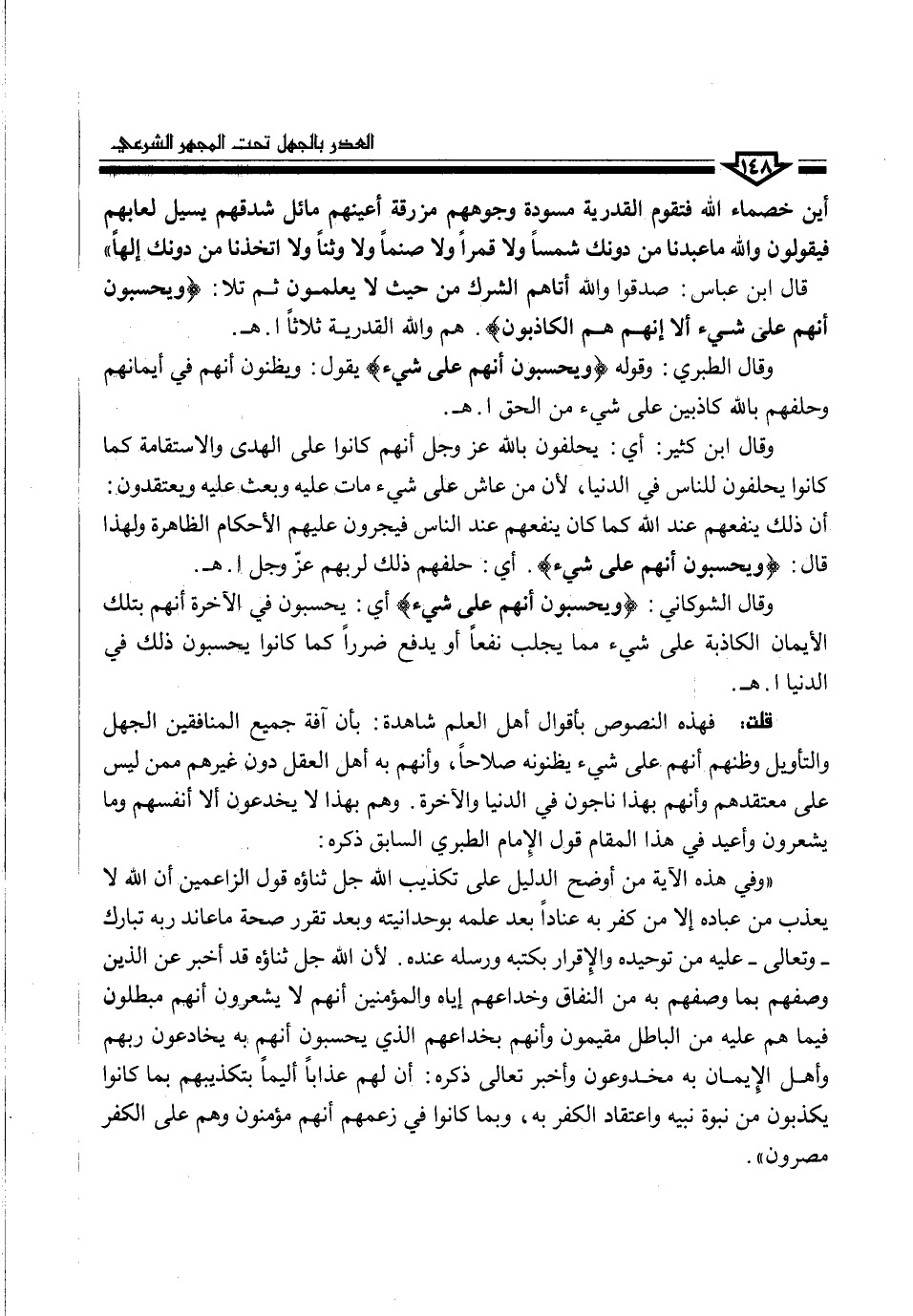 قال ابن عباس: صدقوا والله أتاهم الشرك من حيث لا يعلمون ثم تلا: (وَيَحْسَبُونَ أَنَّهُمْ عَلَى شَيْءٍ أَلَا إِنَّهُمْ هُمُ الْكَاذِبُونَ). هم والله القدرية ثلاثاً ا. هـ.