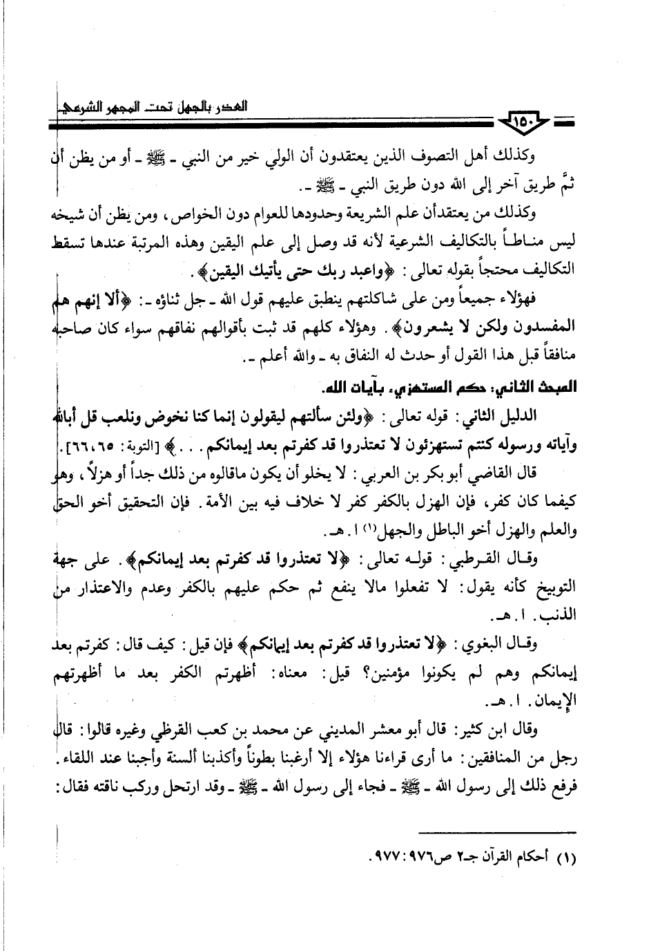 الدليل الثاني: قوله تعالى: (وَلَئِن سَأَلْتَهُمْ لَيَقُولُنَّ إِنَّمَا كُنَّا نَخُوضُ وَنَلْعَبُ قُلْ أَبِاللهِ وَآيَاتِهِ وَرَسُولِهِ كُنتُمْ تَسْتَهْزِئُونَ، لاَ تَعْتَذِرُواْ قَدْ كَفَرْتُم بَعْدَ إِيمَانِكُمْ ...) [التوبة: 65، 66].