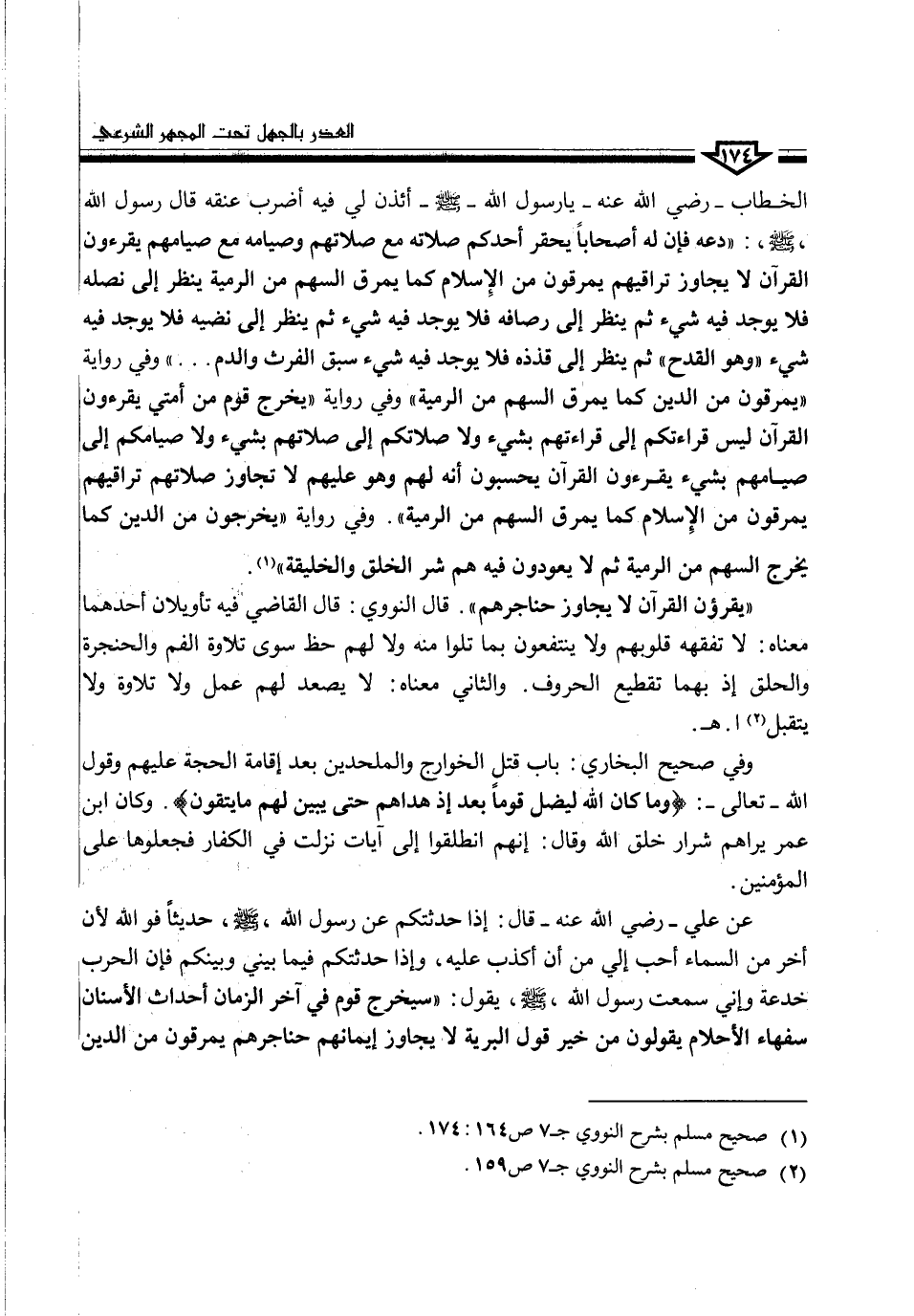 الخطاب -رضي الله عنه- يا رسول الله- صلى الله عليه وسلم- ائذن لي فيه أضرب عنقه قال رسول الله صلى الله عليه وسلم: "دعه فإن له أصحاباً يحقر أحدكم صلاته في صلاتهم وصيامه مع صيامهم يقرءون القرآن لا يجاوز تراقيهم يمرقون من الإسلام كما يمرق السهم من الرمية ينظر إلى نصله فلا يوجد فيه شيء ثم ينظر إلى رصافه فلا يوجد فيه شيء ثم ينظر إلى نضيه فلا يوجد فيه شيء "وهو القدح" ثم ينظر إلى قذذه فلا يوجد فيه شيء سبق الفرث والدم .. " وفي رواية "يمرقون من الدين كما يمرق السهم من الرمية" وفي رواية "يخرج قوم من أمتي يقرءون القرآن ليس قراءتكم إلى قراءتهم بشيء ولا صلاتكم إلى صلاتهم بشيء ولا صيامكم إلى صيامهم بشيء يقرءون القرآن يحسبون أنه لهم وهو عليهم لا تجاوز صلاتهم تراقيهم يمرقون من الإسلام كما يمرق السهم من الرمية". وفي رواية "يخرجون من الدين كما يخرج السهم من الرمية ثم لا يعودون فيه هم شر الخلق والخليقة" (¬1).