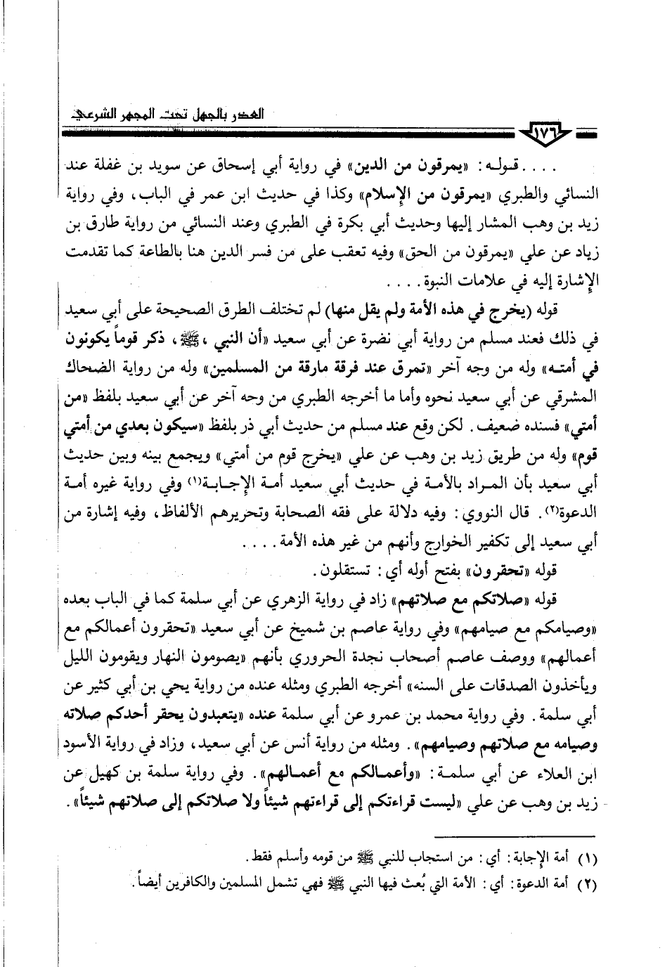 قوله (يخرج في هذه الأمة ولم يقل منها) لم تختلف الطرق الصحيحة على أبي سعيد في ذلك فعند مسلم من رواية أبي نضرة عن أبي سعيد "أن النبي، صلى الله عليه وسلم، ذكر قوماً يكونون في أمته، وله من وجه آخر "تمرق عند فرقة مارقة من المسلمين" وله من رواية الضحاك المشرقي عن أبي سعيد نحوه وأما ما أخرجه الطبري من وجه آخر عن أبي سعيد بلفظ "من أمتي" فسنده ضعيف. لكن وقع عند مسلم من حديث أبي ذر بلفظ "سيكون بعدي من أمتي قوم" وله من طريق زيد بن وهب عن علي "يخرج قوم من أمتي" ويجمع بينه وبين حديث أبي سعيد بأن المراد بالأمة في حديث أبي سعيد أمة الإجابة (¬1) وفي رواية غيره أمة الدعوة (¬2). قال النووي: وفيه دلالة على فقه الصحابة وتحريرهم الألفاظ، وفيه إشارة من أبي سعيد إلى تكفير الخوارج وأنهم من غير هذه الأمة ...