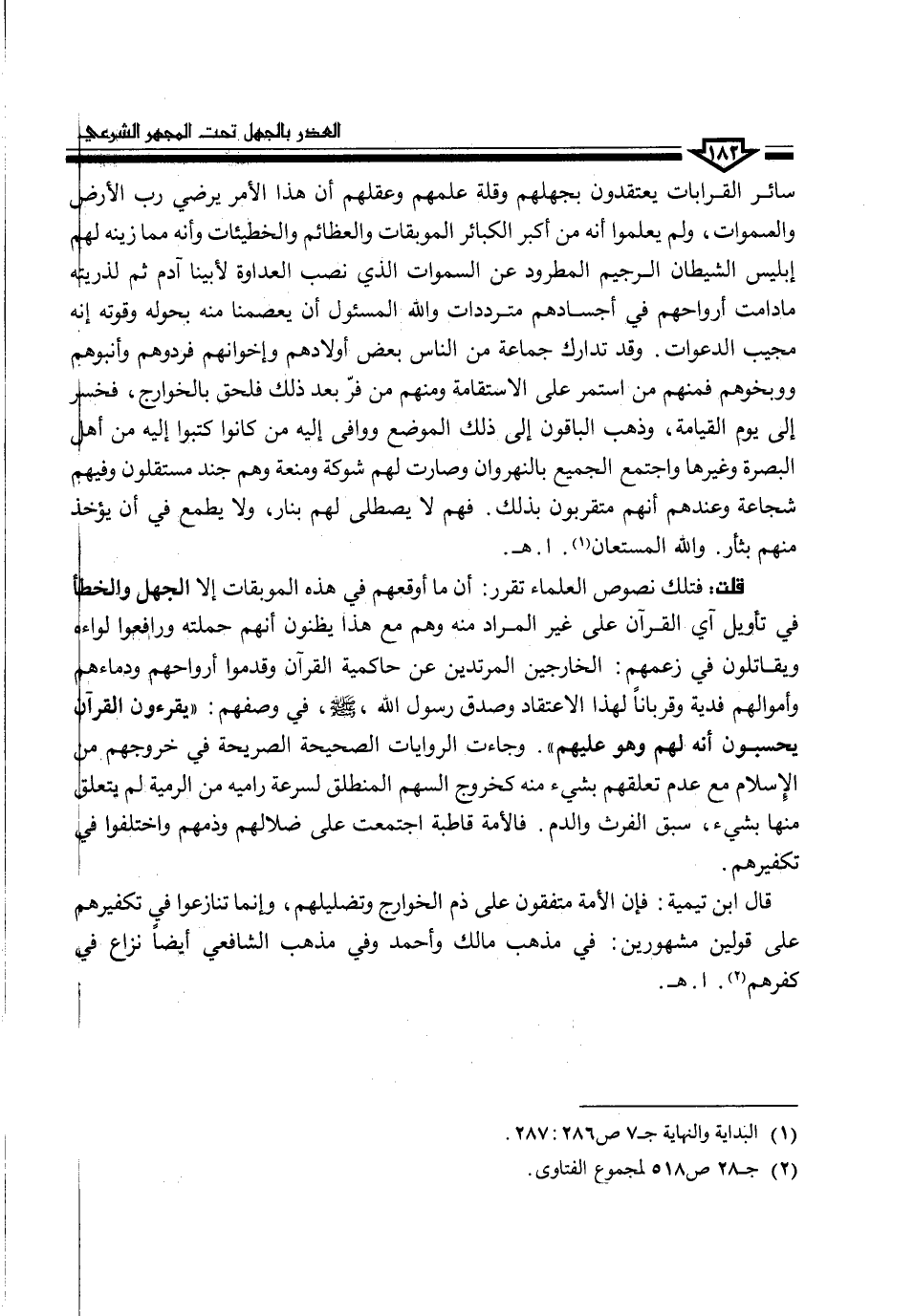 قلت: فتلك نصوص العلماء تقرر: أن ما أوقعهم في هذه الموبقات إلا الجهل والخطأ في تأويل آي القرآن على غير المراد منه وهم مع هذا يظنون أنهم حملته ورافعوا لواءه ويقاتلون في زعمهم: الخارجين المرتدين عن حاكمية القرآن وقدموا أرواحهم ودماءهم وأموالهم فدية وقرباناً لهذا الاعتقاد وصدق رسول الله، صلى الله عليه وسلم، في وصفهم: "يقرءون القرآن يحسبون أنه لهم وهو عليهم". وجاءت الروايات الصحيحة الصريحة في خروجهم من الإسلام مع عدم تعلقهم بشيء منه كخروج السهم المنطلق لسرعة راميه من الرمية لم يتعلق منها بشيء، سبق الفرث والدم، فالأمة قاطبة اجتمعت على ضلالهم وذمهم واختلفوا في تكفيرهم.