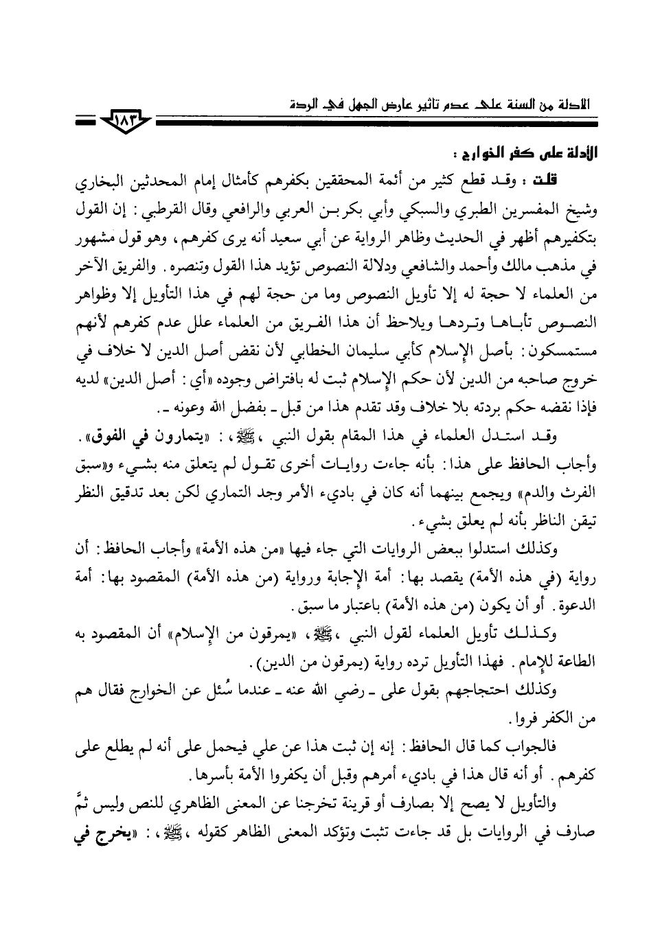 قلت: وقد قطع كثير من أئمة المحققين بكفرهم كأمثال إمام المحدثين البخاري وشيخ المفسرين الطبري والسبكي وأبي بكر بن العربي والرافعي وقال القرطبي: إن القول بتكفيرهم أظهر في الحديث وظاهر الرواية عن أبي سعيد أنه يرى كفرهم، وهو قول مشهور في مذهب مالك وأحمد والشافعي ودلالة النصوص تؤيد هذا القول وتنصره والفريق الآخر من العلماء لا حجة له إلا تأويل النصوص وما من حجة لهم في هذا التأويل إلا وظواهر النصوص تأباها وتردها ويلاحظ أن هذا الفريق من العلماء علل عدم كفرهم لأنهم مستمسكون: بأصل الإسلام كأبي سليمان الخطابي لأن نقض أصل الدين لا خلاف في خروج صاحبه من الدين لأن حكم الإسلام ثبت له بافتراض وجوده "أي: أصل الدين" لديه فإذا نقضه حكم بردته بلا خلاف وقد تقدم هذا من قبل -بفضل الله وعونه-.