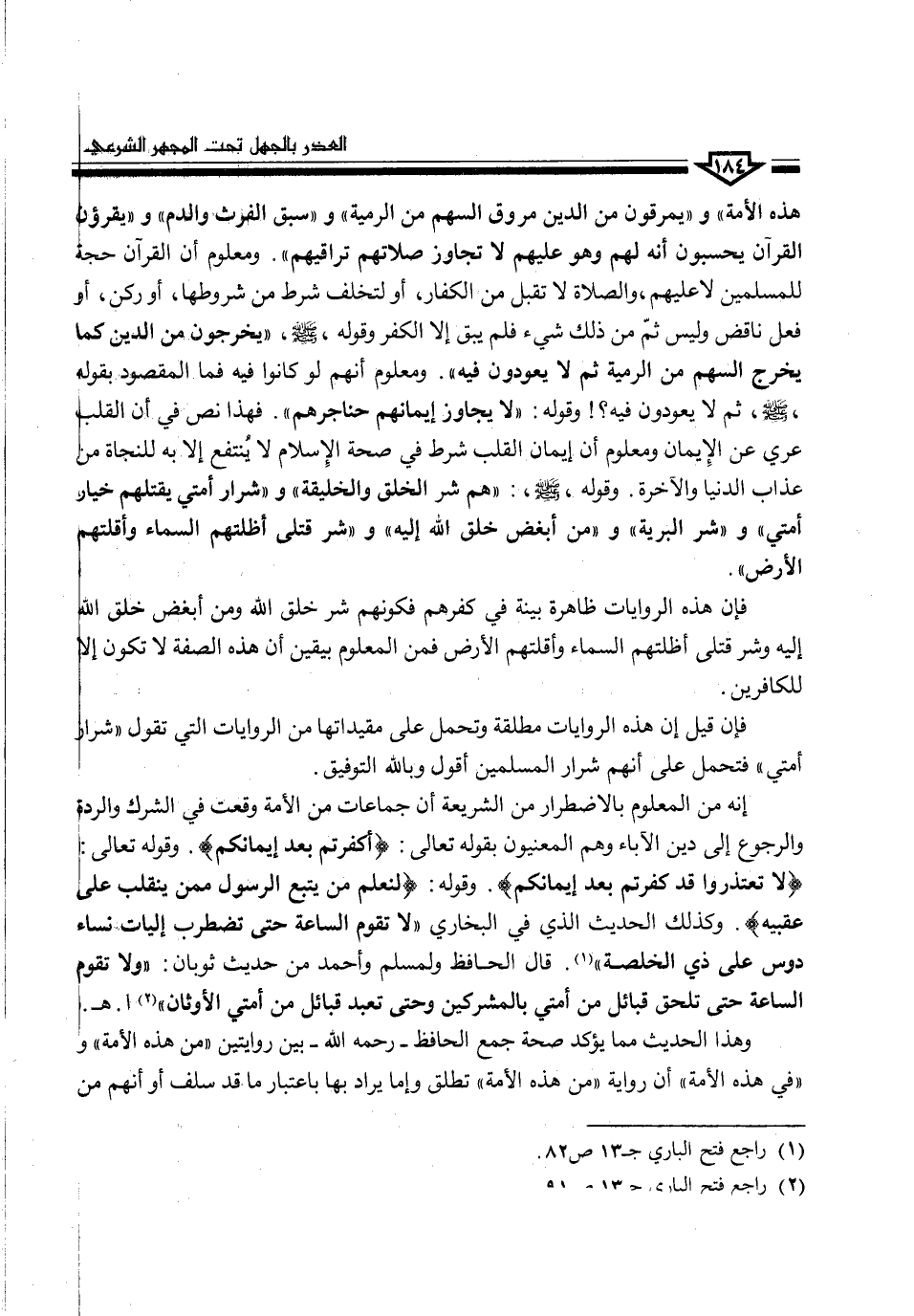 إنه من المعلوم بالاضطرار من الشريعة أن جماعات من الأمة وقعت في الشرك والردة والرجوع إلى دين الآباء وهم المعنيون بقوله تعالى: (أَكْفَرْتُم بَعْدَ إِيمَانِكُمْ). وقوله تعالى: (لاَ تَعْتَذِرُواْ قَدْ كَفَرْتُم بَعْدَ إِيمَانِكُمْ). وقوله: (لِنَعْلَمَ مَن يَتَّبِعُ الرَّسُولَ مِمَّن يَنقَلِبُ عَلَى عَقِبَيْهِ). وكذلك الحديث الذي في البخاري "لا تقوم الساعة حتى تضطرب إليات نساء دوس على ذي الخلصة" (¬1). قال الحافظ والمسلم وأحمد من حديث ثوبان: ولا تقوم الساعة حتى تلحق قبائل من أمتي بالمشركين وحتى تعبد قبائل من أمتي الأوثان" (¬2) ا. هـ.