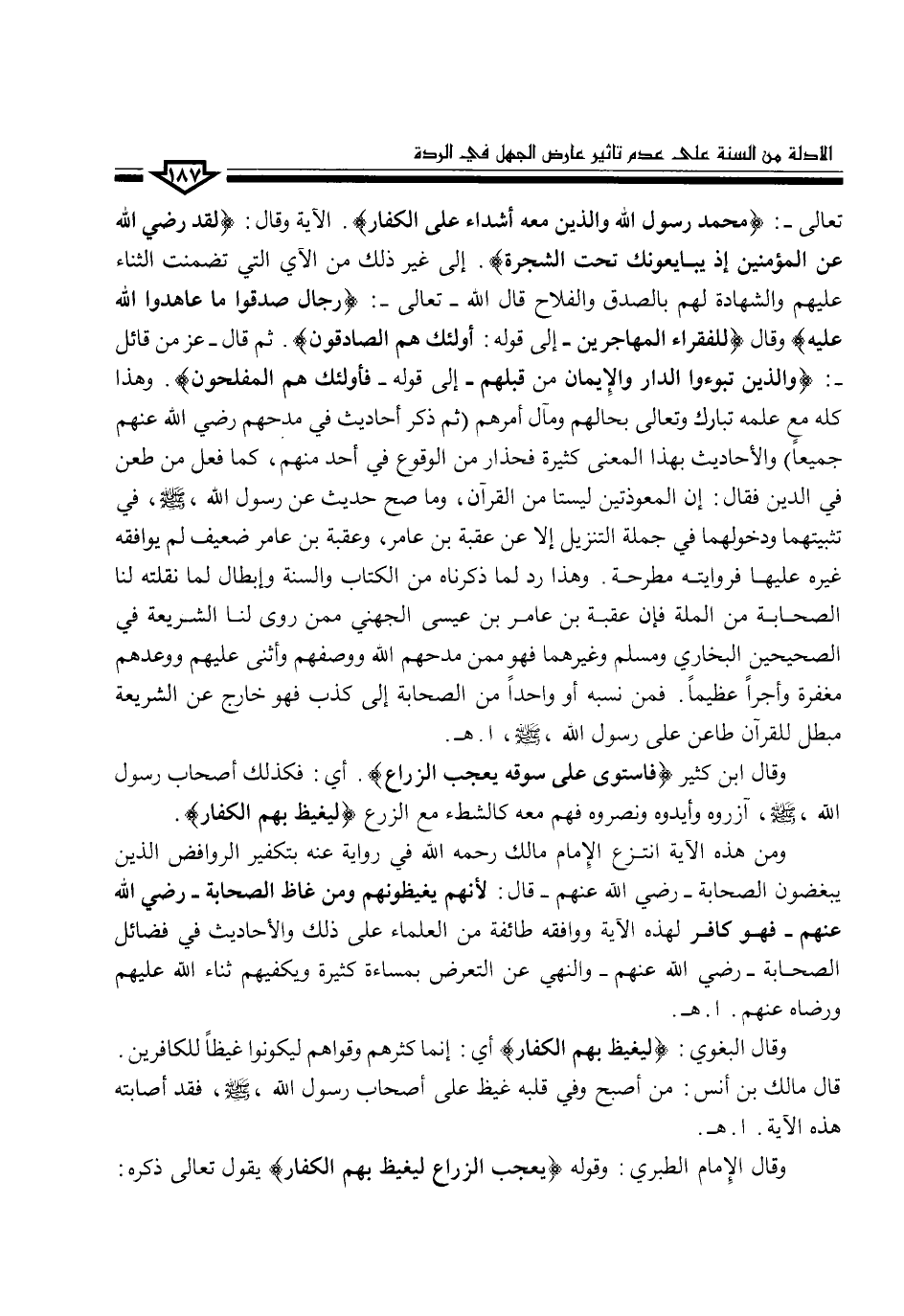 تعالى-: (مُّحَمَّدٌ رَّسُولُ اللَّهِ وَالَّذِينَ مَعَهُ أَشِدَّاء عَلَى الْكُفَّارِ). الآية وقال: (لَقَدْ رَضِيَ اللَّهُ عَنِ الْمُؤْمِنِينَ إِذْ يُبَايِعُونَكَ تَحْتَ الشَّجَرَةِ). إلى غير ذلك من الآي التي تضمنت الثناء عليهم والشهادة لهم بالصدق والفلاح قال الله -تعالى-: (رِجَالٌ صَدَقُوا مَا عَاهَدُوا اللَّهَ عَلَيْهِ) وقال (لِلْفُقَرَاء الْمُهَاجِرِينَ -إلى قوله: أُوْلَئِكَ هُمُ الصَّادِقُونَ). ثم قال -عز من قائل-: (وَالَّذِينَ تَبَوَّؤُوا الدَّارَ وَالْإِيمَانَ مِن قَبْلِهِمْ -إلى قوله- فَأُوْلَئِكَ هُمُ الْمُفْلِحُونَ). وهذا كله مع علمه تبارك وتعالى بحالهم ومآل أمرهم (ثم ذكر أحاديث في مدحهم رضي الله عنهم جميعاً) والأحاديث بهذا المعنى كثيرة فحذار من الوقوع في أحد منهم، كما فعل من طعن في الدين فقال: إن المعوذتين ليستا من القرآن، وما صح حديث عن رسول الله، صلى الله عليه وسلم، في تثبيتهما ودخولهما في جملة التنزيل إلا عن عقبة بن عامر، وعقبة بن عامر ضعيف لم يوافقه غيره عليها فروايته مطرحة. وهذا رد لما ذكرناه من الكتاب والسنة وإبطال لما نقلته لنا الصحابة من الملة فإن عقبة بن عامر بن عيسى الجهني ممن روى لنا الشريعة في الصحيحين البخاري ومسلم وغيرهما فهو ممن مدحهم الله ووصفهم وأثنى عليهم ووعدهم مغفرة وأجراً عظيماً. فمن نسبه أو واحداً من الصحابة إلى كذب فهو خارج عن الشريعة مبطل للقرآن طاعن على رسول الله، صلى الله عليه وسلم، ا. هـ.
