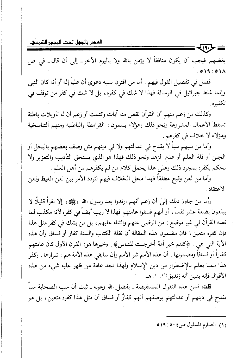 وأما من سبهم سباً لا يقدح في عدالتهم ولا في دينهم مثل وصف بعضهم بالبخل أو الجبن أو قلة العلم أو عدم الزهد ونحو ذلك فهذا هو الذي يستحق التأديب والتعزير ولا نحكم بكفره بمجرد ذلك وعلى هذا يحمل كلام من لم يكفرهم من أهل العلم.