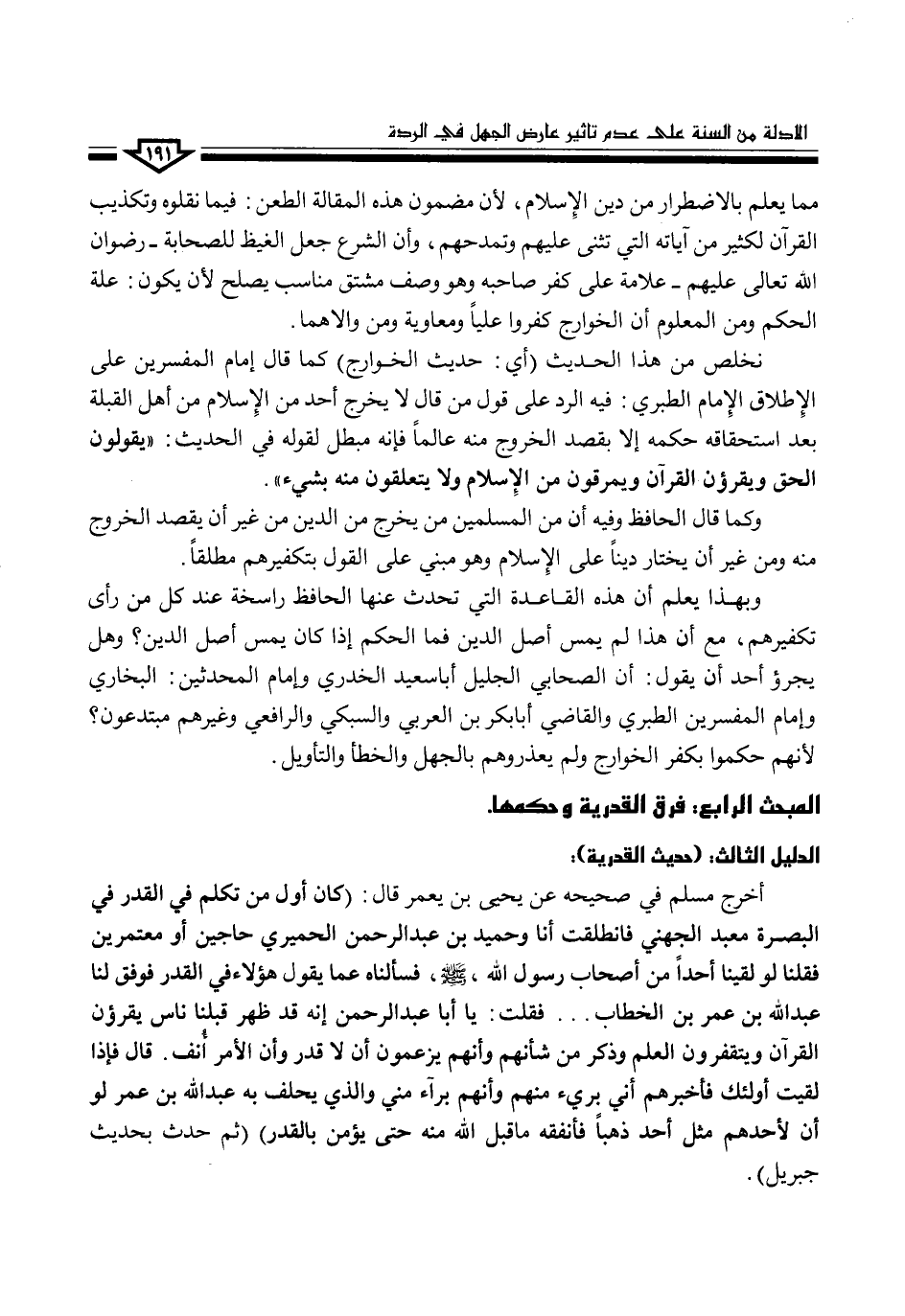نخلص من هذا الحديث (أي: حديث الخوارج) كما قال إمام المفسرين على الإطلاق الإمام الطبري: فيه الرد على قول من قال لا يخرج أحد من الإسلام من أهل القبلة بعد استحقاقه حكمه إلا بقصد الخروج منه عالماً فإنه مبطل لقوله في الحديث: "يقولون الحق ويقرؤون القرآن ويمرقون من الإسلام ولا يتعلقون منه بشيء".