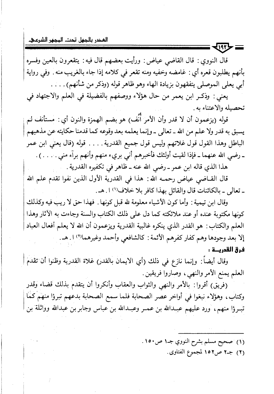 وقال أيضاً: وإنما نازع في ذلك (أي الإيمان بالقدر) غلاة القدرية وظنوا أن تقدم العلم يمنع الأمر والنهي، وصاروا فريقين.