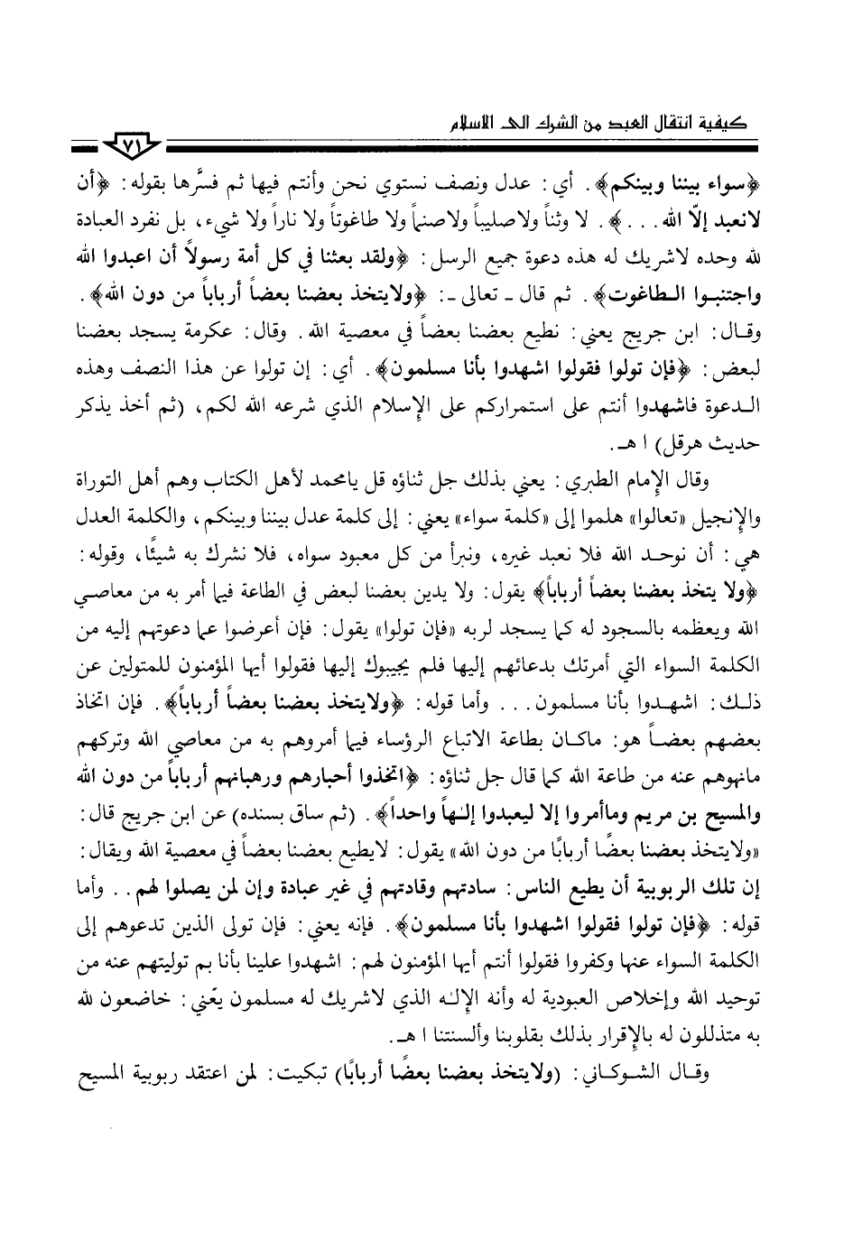 وقال الإمام الطبري: يعني بذلك جل ثناؤه قل يا محمد لأهل الكتاب وهم أهل التوراة والإنجيل "تعالوا" هلموا إلى "كلمة سواء" يعني: إلى كلمة عدل بيننا وبينكم، والكلمة العدل هي: أن نوحد الله فلا نعبد غيره، ونبرأ من كل معبود سواه، فلا نشرك به شيئاً، وقوله: (وَلاَ يَتَّخِذَ بَعْضُنَا بَعْضاً أَرْبَاباً) يقول: ولا يدين بعضنا لبعض في الطاعة فيما أمر به من معاصي الله ويعظمه بالسجود له كما يسجد لربه "فإن تولوا" يقول: فإن أعرضوا عما دعوتهم إليه من الكلمة السواء التي أمرتك بدعائهم إليها فلم يجيبوك إليها فقولوا أيها المؤمنون للمتولين عن ذلك: اشهدوا بأنا مسلمون ... وأما قوله: (وَلاَ يَتَّخِذَ بَعْضُنَا بَعْضاً أَرْبَاباً). فإن اتخاذ بعضهم بعضاً هو: ما كان بطاعة الاتباع الرؤساء فيما أمروهم به من معاصي الله وتركهم ما نهوهم عنه من طاعة الله كما قال جل ثناؤه: (اتَّخَذُواْ أَحْبَارَهُمْ وَرُهْبَانَهُمْ أَرْبَاباً مِّن دُونِ اللهِ وَالْمَسِيحَ ابْنَ مَرْيَمَ وَمَا أُمِرُواْ إِلاَّ لِيَعْبُدُواْ إِلَهاً وَاحِداً). (ثم ساق بسنده) عن ابن جريج قال: "وَلاَ يَتَّخِذَ بَعْضُنَا بَعْضاً أَرْبَاباً" يقول: لا يطيع بعضنا بعضاً في معصية الله ويقال: إن تلك الربوبية أن يطيع الناس: سادتهم وقادتهم في غير عبادة وإن لن يصلوا لهم .. وأما قوله: (فَإِن تَوَلَّوْاْ فَقُولُواْ اشْهَدُواْ بِأَنَّا مُسْلِمُونَ). فإنه يعني: فإن تولى الذين تدعوهم إلى الكلمة السواء عنها وكفروا فقولوا أنتم أيها المؤمنون لهم: اشهدوا علينا بأنا بم توليتهم عنه من توحيد الله وإخلاص العبودية له وأنه الإله الذي لا شريك له مسلمون يعني: خاضعون لله به متذللون له بالإقرار بذلك بقلوبنا وألسنتنا اهـ.
