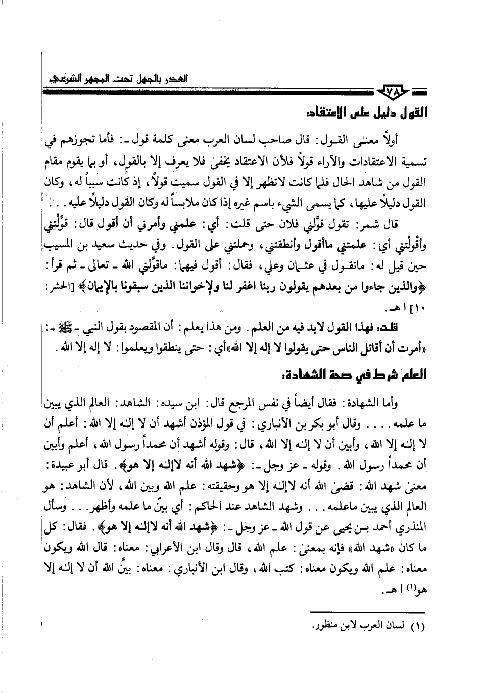 قلت: فهذا القول لا بد فيه من العلم. ومن هذا يعلم: أن المقصود بقول النبي -صلى الله عليه وسلم-: "أمرت أن أقاتل الناس حتى يقولوا لا إله إلا الله" أي: حتى ينطقوا ويعلموا: لا إله إلا الله.