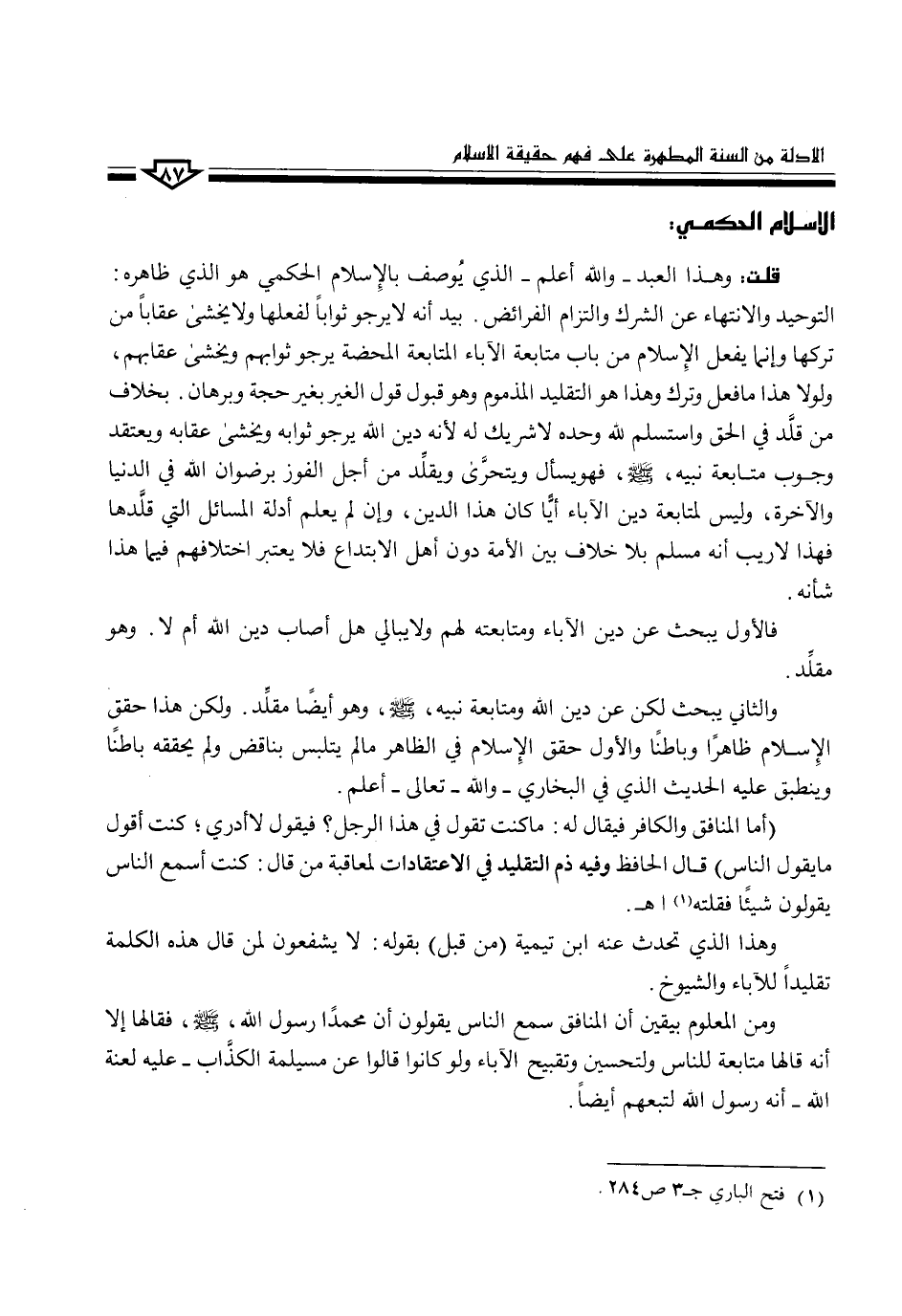 قلت: وهذا العبد -والله أعلم- الذي يوصف بالإسلام الحكمي هو الذي ظاهره: التوحيد والانتهاء عن الشرك والتزام الفرائض. بيد أنه لا يرجو ثواباً لفعلها ولا يخشى عقاباً من تركها وإنما يفعل الإسلام من باب متابعة الآباء المتابعة المحضة يرجو ثوابهم ويخشى عقابهم، ولولا هذا ما فعل وترك وهذا هو التقليد المذموم وهو قبول قول الغير بغير حجة وبرهان. بخلاف من قلّد في الحق واستسلم لله وحده لا شريك له لأنه دين الله يرجو ثوابه ويخشى عقابه ويعتقد وجوب متابعة نبيه، صلى الله عليه وسلم، فهو يسأل ويتحرى ويقلِّد من أجل الفوز برضوان الله في الدنيا والآخرة، وليس لمتابعة دين الآباء أياً كان هذا الدين، وإن لم يعلم أدلة المسائل التي قلدها فهذا لا ريب أنه مسلم بلا خلاف بين الأمة دون أهل الابتداع فلا يعتبر اختلافهم فيما هذا شأنه.