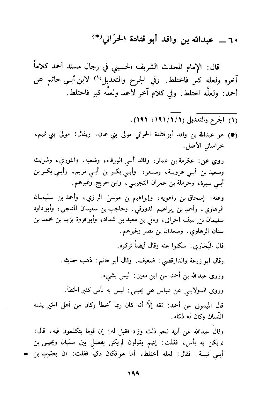 Qقلت: وعبد الله بن واقد أبو قتادة الحراني من رجال المسند وليست له رواية عن أي من الأئمة أصحاب الكتب الستة كان له فضل وعبادة وكان عفيفا متفقها بقول أبي حنيفة غير متهم في نفسه ولا يتعمد الكذب. قال عنه ابن عدي: ليس هو عندي ممن يتعمد الكذب إنما يخطئ ولكنه كان متروك الحديث ولا تقوم بحديثه حجة. روى المناكير وكان يدلس وكان أحمد يثني عليه وينسبه إلى الكبر والاختلاط وعلى صحة وقوعه في التغير والاختلاط فمثله لا يلتفت إليه في اختلاطه والآولى ادخار الوقت والجهد لغيره فمثله يترك حديثه قبل وبعد الاختلاط ومن ثم فلا معنى للتحقيق في اختلاطه بل الأولى عدم إيراده ابتداء في مثل هذا لأن الغرض من معرفة المختلطين هو أخذ حديث الثقات قبل اختلاطهم وتغيرهم في آخر أعمارهم. والله تعالى أعلم.