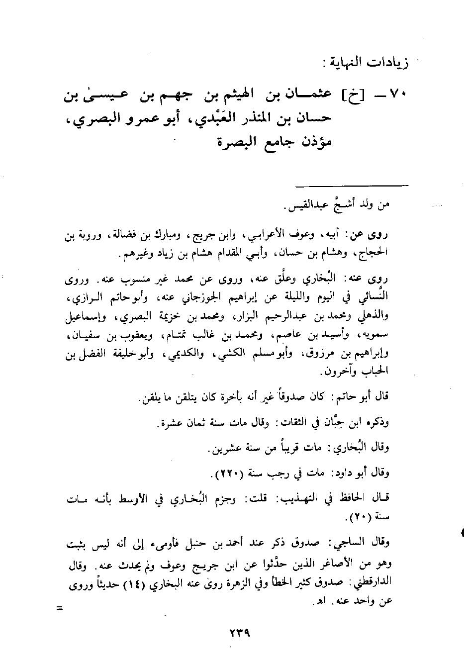 70 -[خ] عثمان بن الهيثم بن جهم بن عيسى بن حسان بن المنذر العَبْدي، أبو عمرو البصري مؤذن جامع البصرة