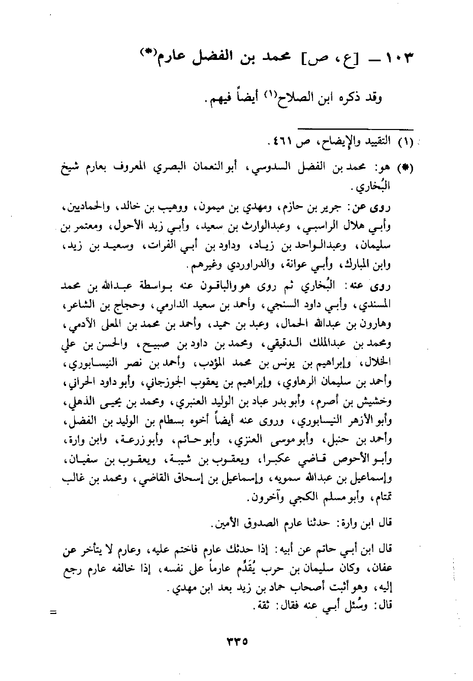 فالحق أن ابن حبان لم يكن متهوراً في عارم كما وصفه الذهبي، فإن رأيه في عارم موافق من قريب لرأي أبي حاتم حيث قال: اختلط عارم في آخر عمره وزال عقله فمن سمع منه قبل الاختلاط فسماعه صحيح، وكتبت عنه قبل الاختلاط سنة أربع عشرة، ولم أسمع منه بعدما اختلاط أهـ. وهو كلام أبي حاتم المذكور من قبل بل إن حبان التزم القاعدة التي وضعها لنفسه في أول الكتاب لمن تغير بأخرة وقد اشار إلى هذه القاعدة متعقباً على رأيه في عارم فقال: هذا حكم من تغير آخر عمره واختلط إذا كان قبل الاختلاط صدوقاً وهو مما يعرف بالكتابة والجمع والاتقان أهـ