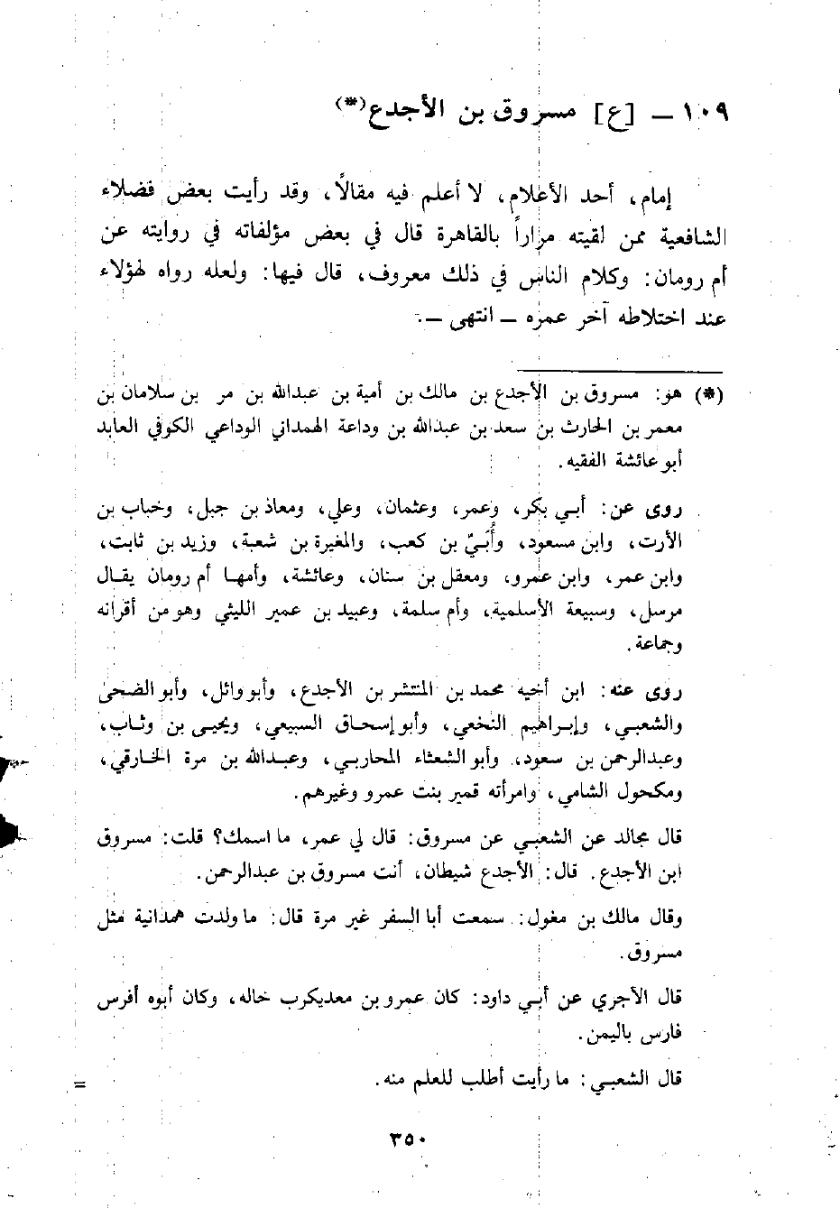 أما ما أورده الحاظ برهان الدين الحلبي عن بعض فضلاء الشافعية أنه ذكر في بعض مؤلفاته روايته عن أم رومان ونسبه فيها إلى الاختلاط وقال: ولعله رواه لهؤلاء عند اختلاطه آخر عمره. فلم يحدد اسم من قال ذلك ولا اسم هذه المؤلفات التي نسب فيها مسروق إلى الاختلاط حتى يمكن الرجوع إليها، ثم إن هذا المشار إليه أنه من فضلاء الشافعية إنما نسبه إلى الاختلاط بصيغة ممرضة لم يقطع فيها بتغيره ووقوعه في الاختلاط، وأيضاً فإن أحداً من الأئمة لم ينسبه إلى الاختلاط فلا عبرة بقول هذا المجهول المخالف لأقوال الأئمة في مسروق، وكان الأحرى بالحافظ برهان الدين الحلبي ألا يذكر مسروقاً فيمن اختلطوا. والله تعالى أعلم.