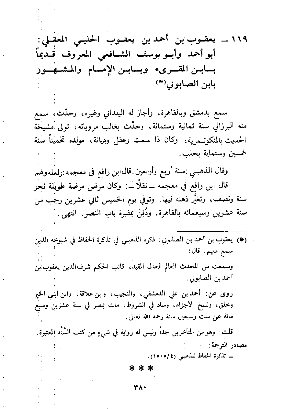 119 - يعقوب بن أحمد بن يعقوب الحلبي المعقلي أبو أحمد وأبو يوسف الشافعي المعروف قديما بابن المقرىء وبابن الإمام والمشهور بابن الصابوني