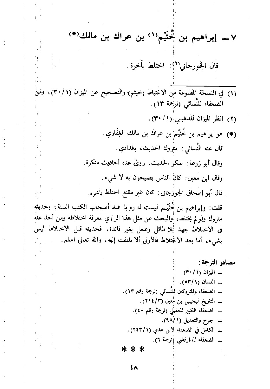 Qقلت: وإبراهيم بن خثيم ليست له رواية عند أصحاب الكتب الستة، وحديثه متروك ولو لم يختلط، والبحث عن مثل هذا الراوي لمعرفة اختلاطه ومن أخذ عنه في الاختلاط جهد بلا طائل وعمل بلا فائدة، فحديثه بعد الاختلاط ليس بشيء، أما بعد الاختلاط فالأولى ألا يلتفت إليه، والله تعالى أعلم.