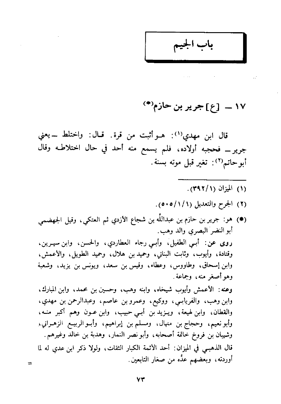 Qقلت وجرير بن حازم بن الأزدي أبو النضر البصري، هو كما قال الذهبي: أحد الأئمة الكبار الثقات، مستقيم الحديث إلا عن قتادة فإن حديثه عنه فيه ضعف، روى عنه مناكير، وهذا لا يسقط الرجل جملة وإنما ينفي هذا الموضع من حديثهن كما أن له أوهام إذا حدث من حفظه، والوهم اليسير لا يضر الراوي، فقد يقع فيه الكبار. أما عن اختلاطه وتغيره فقد وقت أبو حاتم وأبو نعيم الفترة التي اختلط فيها قبل موته بسنة، ولكن اختلاطه هذا لا يضره، ولا يقدح في حديثه، فقد كان أولاده أصحاب حديث فحجبوه، ولم يسمع منه أحد حال اختلاطه، فكل من روى عنه إنما روى عنه قبل الاختلاط، قال أحمد بن سنان عن ابن مهدي: " جرير بن حازم اختلط وكان أولاده أصحاب حديث، فلما أحسوا ذلك منه حجبوه، فلم يسمع أحد منه حال اختلاطه شيئاً". وروايته في الكتب الستة جميعاً.