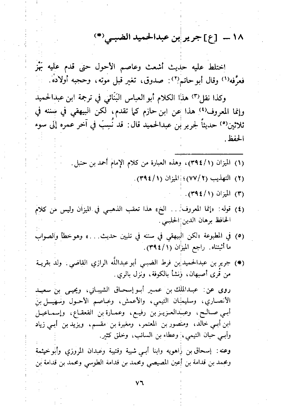 Qقلت: وجرير بن عبد الحميد الضبي الكوفي أحد الثقات صحيح الكتاب روايته في الكتب الستة كلها نسب في آخر عمره إلى سوء الحفظ كما نص عليه البيهقي. أما ما قاله أبو حاتم وأبو العباس البنائي من أنه تغير قبل موته وحجبه أولاده فلا يصح وإنما عرف ذلك عن جرير بن حازم صاحب الترجمة السابقة وقد تعب الذهبي في ميزانه هذ الكلام ورده وبين أن الذي حجبه أولاده هو جرير بن حازم، وهذا ما نقله صاحب الاغتباط ولذا تعقب الحافظ ابن حجر كلام أبي حاتم هذا فقال في التهذيب: "وذكر صاحب الحافل عن أبي حاتم أنه تغير قبل موته بسنة فحجبه أولاده، هذا ليس بمستقيم فإن هذا إنما وقع لجرير بن حازم فكأنه اشتبه على صاحب الحافل". أما ما ذكر في ترجمته من قول الإمام أحمد بن حنبل: " لم يكن بالذكي، اختلط عليه حديث أشعث وعاصم الأحول حتى قدم عليه بهز فعرفه". فهذا لا يدخل في معنى الاختلاط اصطلاحاً ولذلك قيل ليحيى بن معين عقي هذه الحكاية: كيف تروي عن جرير؟ قال: ألا تراه قد بين لهم أمرها. ولكن يبقى قول البيهقي في سننه في نحو ثلاثين حديثاً لجرير بن عبد الحميد قد نسب في آخر عمره إلى سوء الحفظ.