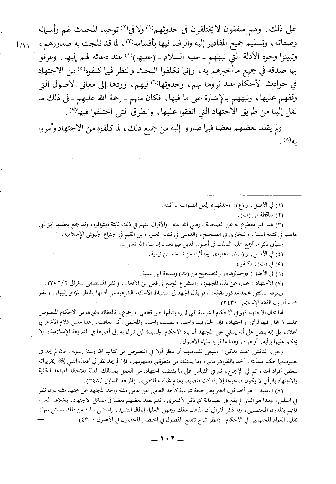 على ذلك، وهم متفقون لا يختلفون في حدوثهم1 ولا في2 توحيد المحدث لهم وأسمائه وصفاته، وتسليم جميع المقادير إليه والرضا فيها بأقسامه3، لما قد ثلجت به صدورهم، وتبينوا وجوه الأدلة التي نبههم عليه السلام (عليها) 4 عند دعائه لهم إليها. وعرفوا بها صدقه في جميع ما أخبرهم به، وإنما تكلفوا البحث والنظر فيما كلفوه5 من الاجتهاد في حوادث الأحكام عند نزولها بهم، وحدوثها6 فيهم، وردها إلى معاني الأصول التي وقفهم عليها، ونبههم بالإشارة على ما فيها، فكان منهم - رحمة الله عليهم - في ذلك ما نقل إلينا من طريق الاجتهاد التي اتفقوا عليها، والطرق التي اختلفوا فيها7.