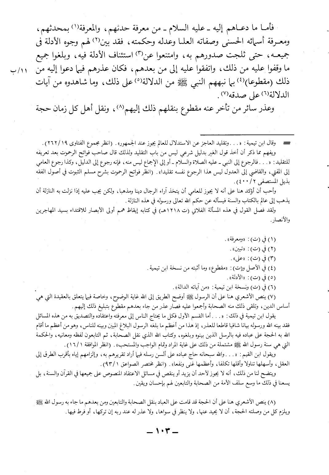 7 ينص الأشعري هنا على أن الرسول صلى الله عليه وسلم أوضح الطريق إلى الله غاية الوضوح، وخاصة فيما يتعلق بالعقيدة التي هي أساس الدين، وتلقى ذلك منه الصحابة وأجمعوا عليه فصار عذر من جاء بعدهم مقطوع بتبليغ ذلك إليهم.