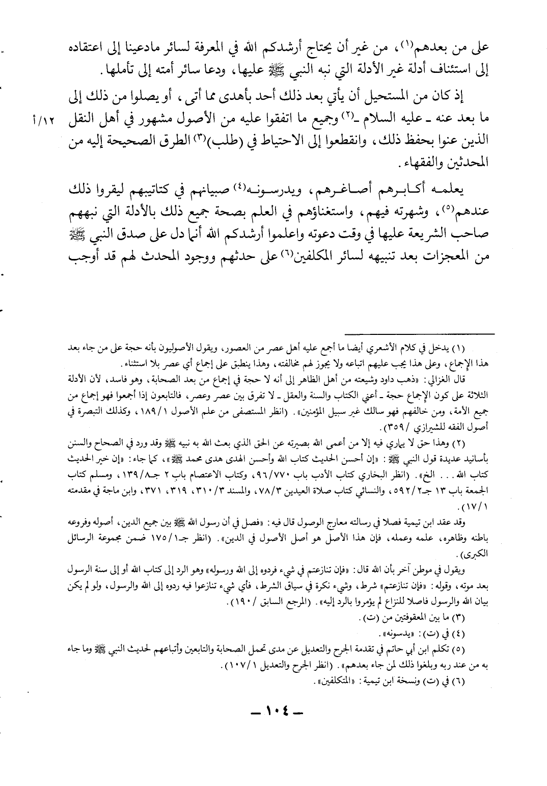 إذ كان من المستحيل أن يأتي بعد ذلك أحد بأهدى مما أتى، أو يصلوا من ذلك إلى ما بعد عنه عليه السلام 2 وجميع ما اتفقوا عليه من الأصول مشهور في أهل النقل الذين عنوا بحفظ ذلك، وانقطعوا إلى الاحتياط في (طلب) 3 الطرق الصحيحة إليه من المحدثين والفقهاء.