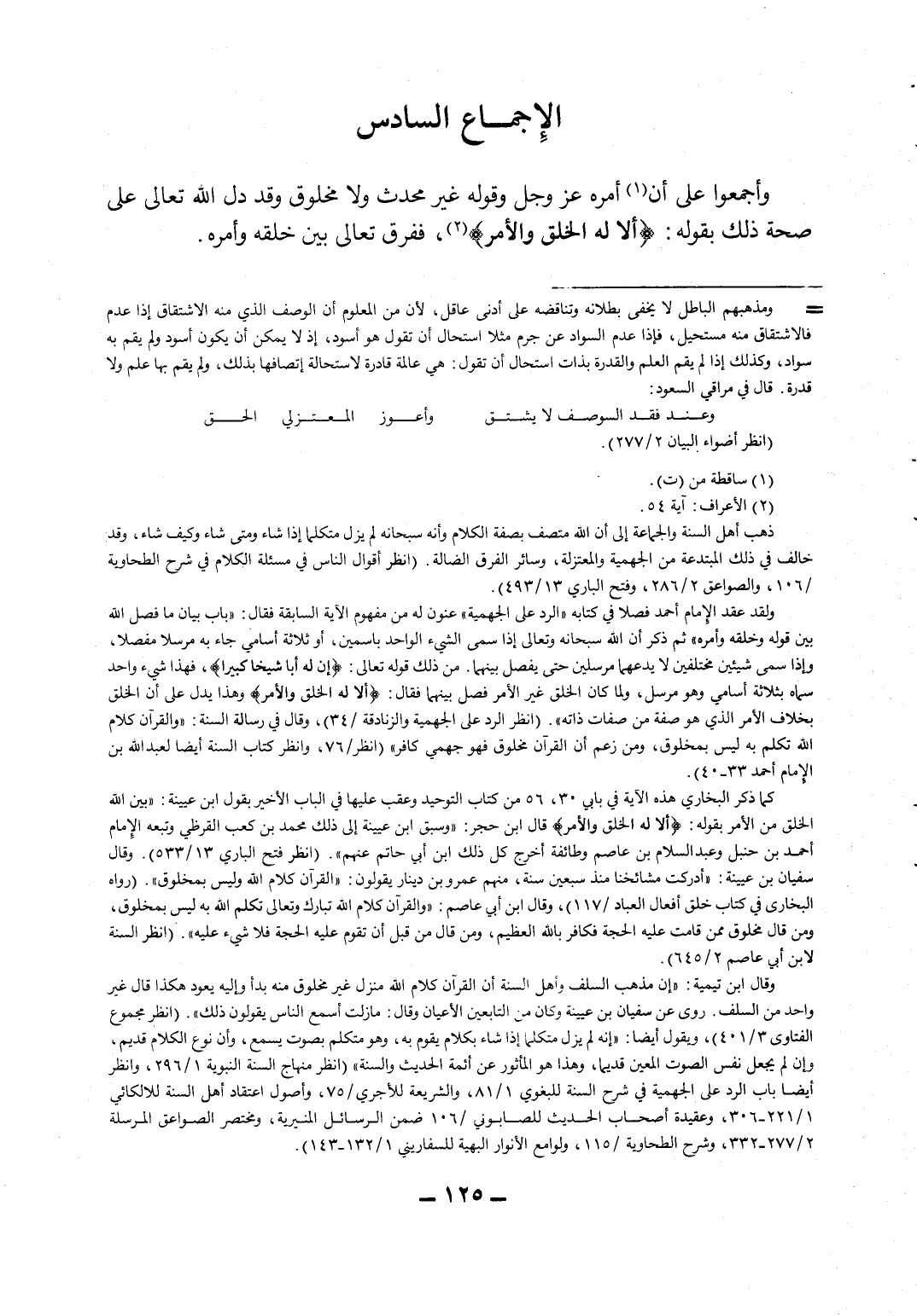 كما ذكر البخاري هذه الآية في بابي 30، 56 من كتاب التوحيد وعقب عليها في الباب الأخير بقول ابن عيينة: "بين الله الخلق من الأمر بقوله: {أَلا لَهُ الْخَلْقُ وَالأَمْرُ} . قال ابن حجر: "وسبق ابن عيينة إلى ذلك محمد بن كعب القرظي وتبعه الإمام أحمد بن حنبل وعبد السلام بن عاصم وطائفة أخرج كل ذلك ابن أبي حاتم عنهم". (انظر فتح الباري 13/533) . وقال سفيان بن عيينة: "أدركت مشايخنا منذ سبعين سنة، منهم عمرو بن دينار يقولون: "القرآن كلام الله وليس بمخلوق". (رواه البخاري في كتاب خلق أفعال العباد ص117) ، وقال ابن أبي عاصم: "والقرآن كلام الله تبارك وتعالى تكلم الله به ليس بمخلوق، ومن قال مخلوق ممن قامت عليه الحجة فكافر بالله العظيم، ومن قال من قبل أن تقوم عليه الحجة فلا شيء عليه". (انظر السنة لابن أبي عاصم 2/645) .