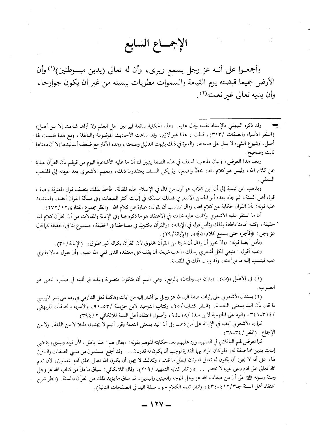 وأجمعوا على أنه عز وجل يسمع ويرى، وأن له تعالى (يدين مبسوطتين) 1 وأن الأرض جميعا قبضته يوم القيامة والسماوات مطويات بيمينه من غير أن يكون جوارحاً، وأن يديه تعالى غير نعمته2.