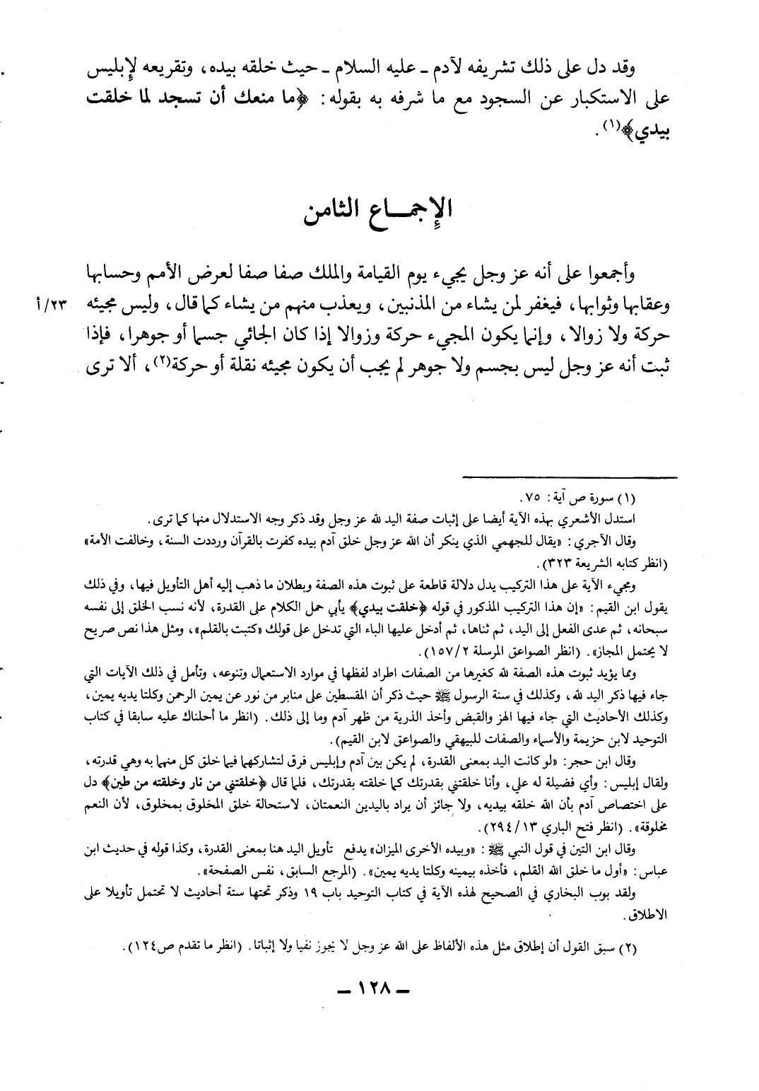 وقال ابن حجر: "لو كانت اليد بمعنى القدرة، لم يكن بين آدم وإبليس فرق لتشاركهما فيما خلق كل منهما به وهي قدرته، ولقال إبليس: وأي فضيلة له علي، وأنا خلقتني بقدرتك كما خلقته بقدرتك، فلما قال {خَلَقْتَنِي مِنْ نَارٍ وَخَلَقْتَهُ مِنْ طِينٍ} دل على اختصاص آدم بأن الله خلقه بيديه، ولا جائز أن يراد باليدين النعمتان؛ لاستحالة خلق المخلوق بمخلوق، لأن النعم مخلوقة". (انظر فتح الباري 13/294) .