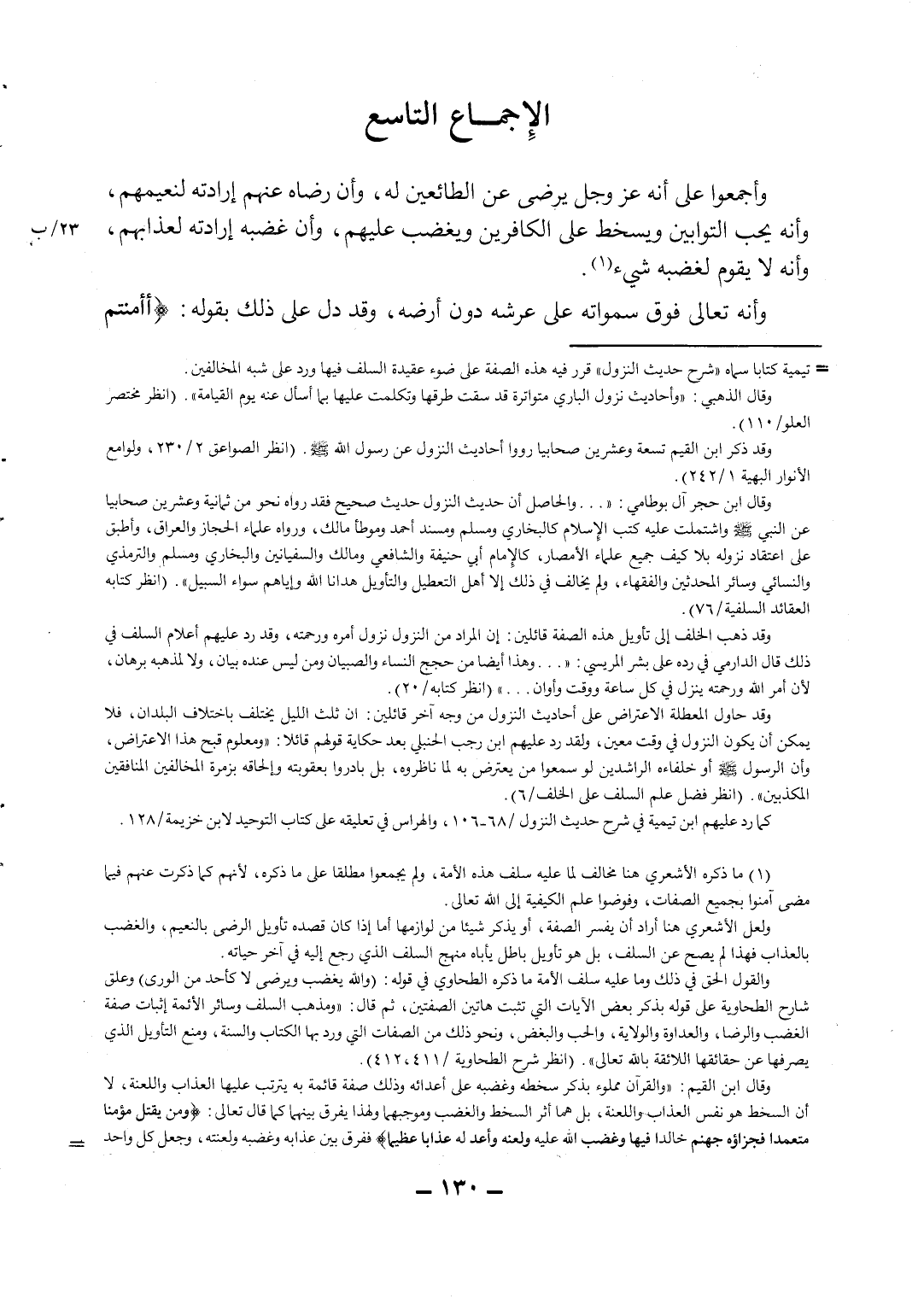 1 ما ذكره الأشعري هنا مخالف لما عليه سلف هذه الأمة، ولم يجمعوا مطلقاً على ما ذكره؛ لأنهم كما ذكرت عنهم فيما مضى آمنوا بجميع الصفات، وفوضوا علم الكيفية إلى الله تعالى.