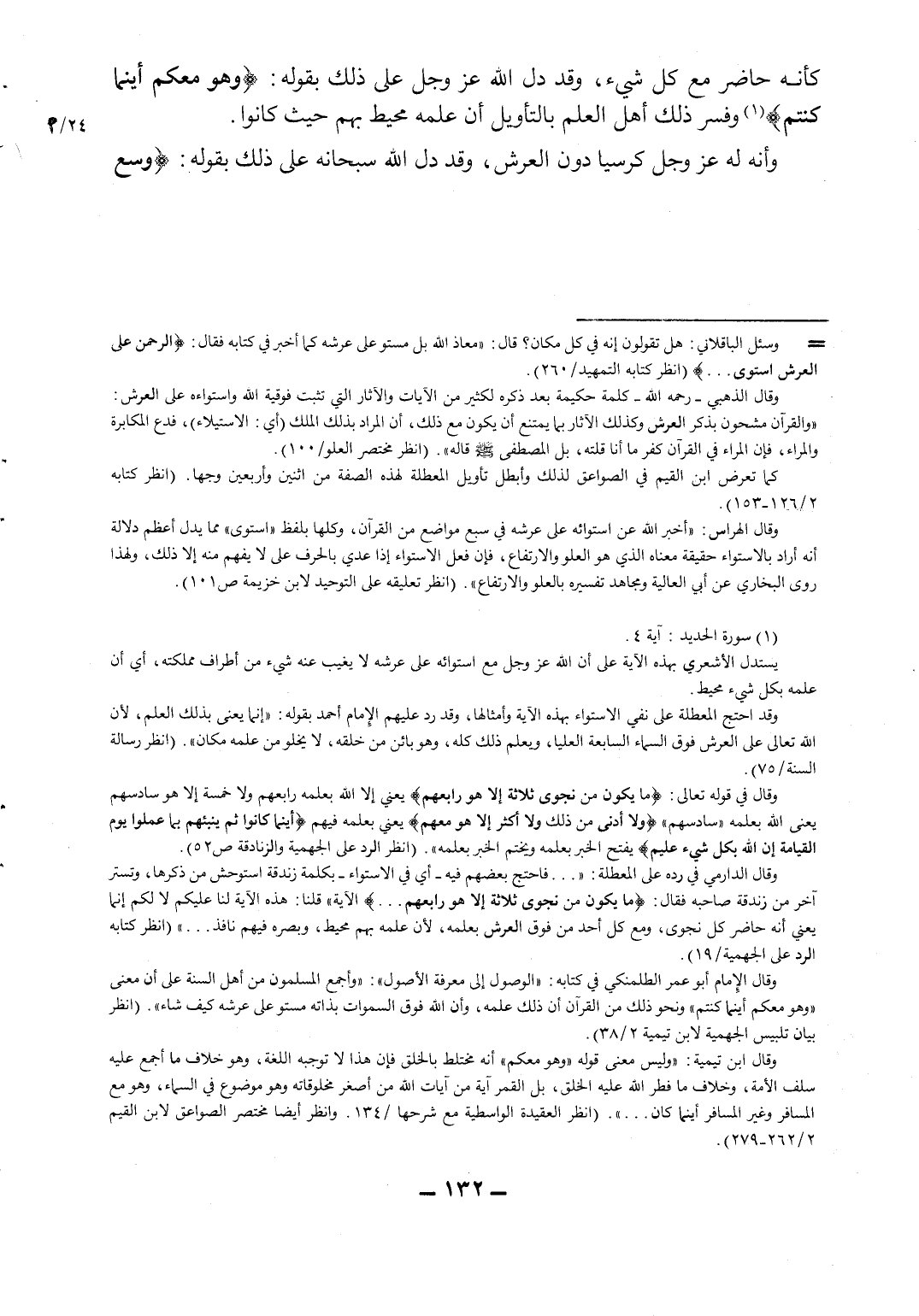 وقال الإمام أبو عمر الطلمنكي في كتابه: "الوصول إلى معرفة الأصول": "وأجمع المسلمون من أهل السنة على أن معنى {وَهُوَ مَعَكُمْ أَيْنَ مَا كُنْتُمْ} ونحو ذلك من القرآن أن ذلك علمه، وأن الله فوق السماوات بذاته مستو على عرشه كيف شاء". (انظر بيان تلبيس الجهمية لابن تيمية 2/38) .