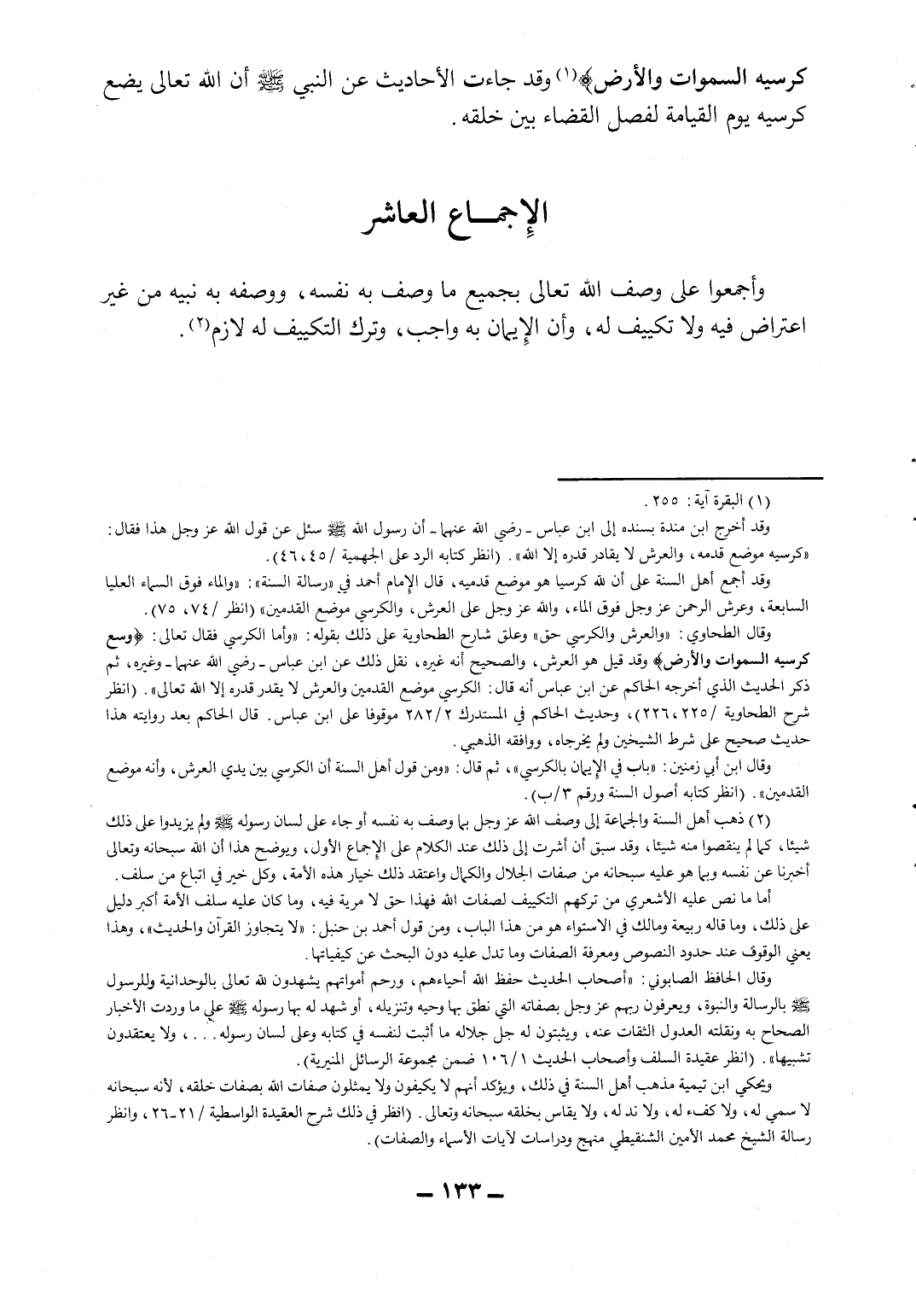 وأجمعوا على وصف الله تعالى بجميع ما وصف به نفسه، ووصفه به نبيه من غير اعتراض فيه ولا تكييف له، وأن الإيمان به واجب، وترك التكييف له لازم2.