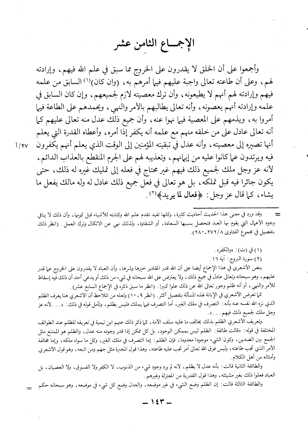 ينص الأشعري في هذا الإجماع أيضاً على أن الله قدر المقادير خيرها وشرها، وأن العباد لا يقدرون على الخروج عما قدر عليهم، وهو سبحانه وتعالى عادل في جميع ذلك، ولا يعترض على الله سبحانه في شيء من ذلك أو يدعي أحد أن ذلك فيه إسقاط للأمر والنهي، أو أنه ظلم وجور تعالى الله عن ذلك علواً كبيراً. (انظر ما سبق ذكره في الإجماع السابع عشر)