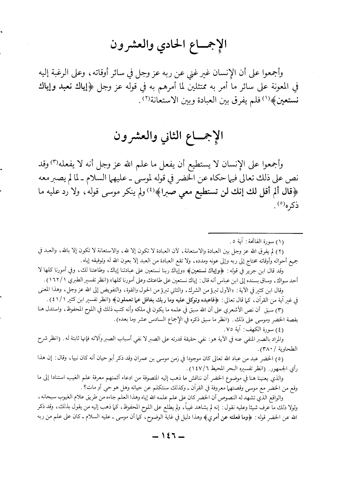 3 سبق أن نص الأشعري على أن الله سبق في علمه ما يكون في ملكه وأنه كتب ذلك في اللوح المحفوظ، واستدل هنا بقصة الخضر وموسى على ذلك. (انظر ما سبق ذكره في الإجماع السادس عشر وما بعده) .