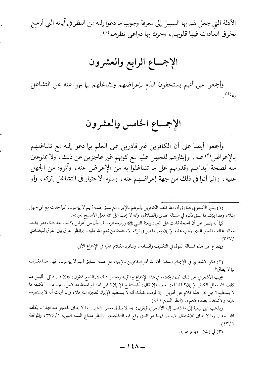1 يشير الأشعري هنا إلى أن الله كلف الكافرين وأمرهم بالإيمان مع سبق علمه أنهم لا يؤمنون، كما حدث مع أبي جهل مثلاً، وهذا يؤكد ما سبق ذكره في مسألة الهدى والضلال، وأنه لا يجب على الله فعل الأصلح لعباده.