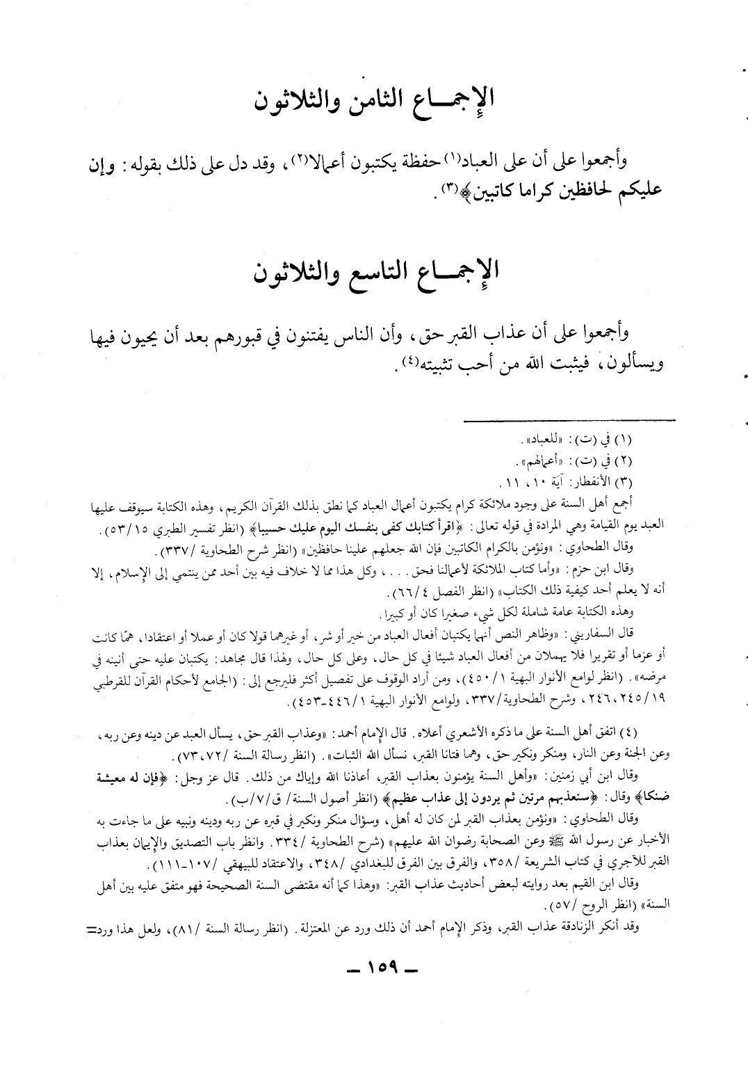 وأجمعوا على أن على العباد2 حفظة يكتبون أعمالاً3، وقد دل على ذلك بقوله: {وَإِنَّ عَلَيْكُمْ لَحَافِظِينَ كِرَاماً كَاتِبِينَ} 4.