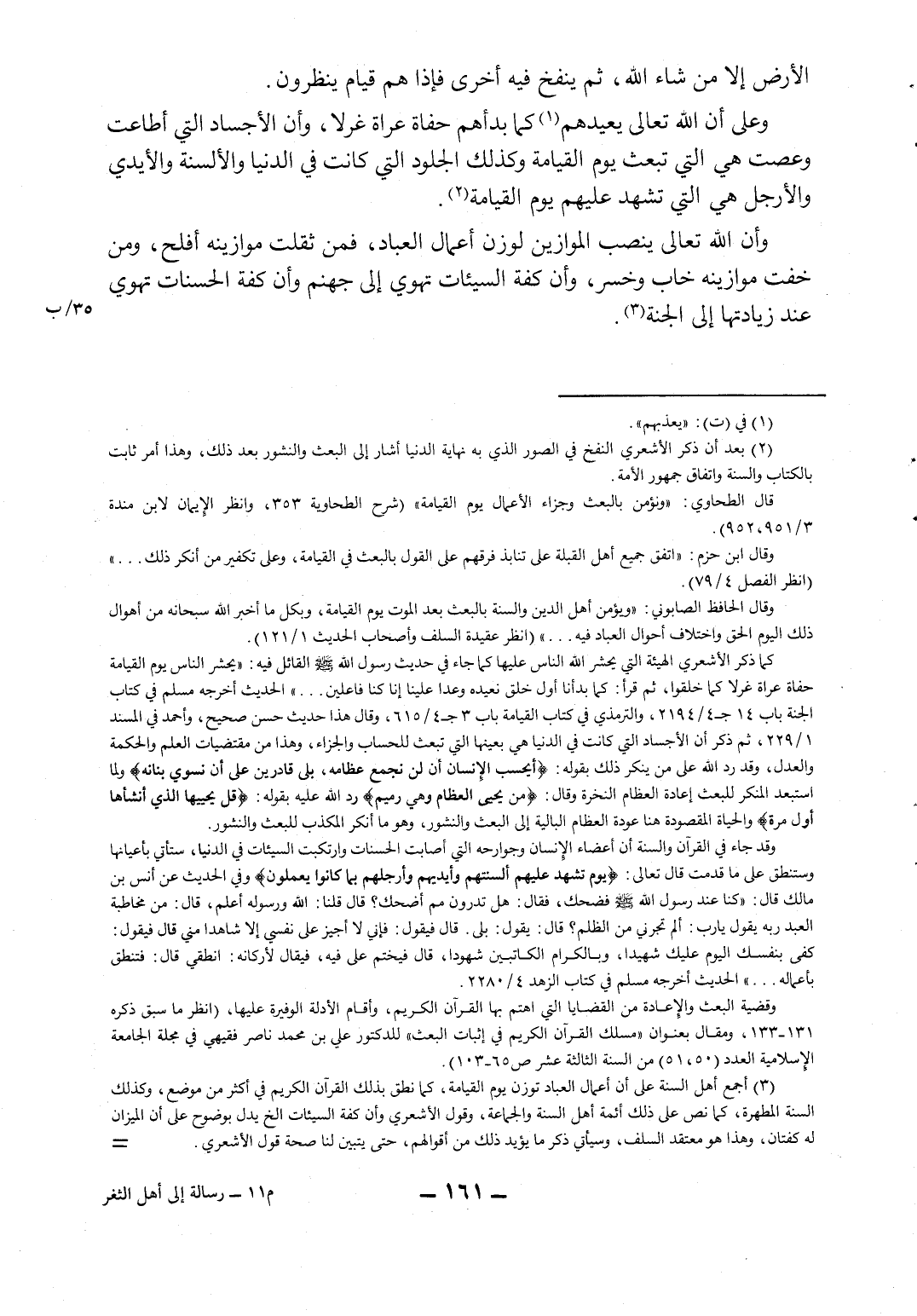 3 أجمع أهل السنة على أن أعمال العباد توزن يوم القيامة، كما نطق بذلك القرآن الكريم في أكثر من موضع، وكذلك السنة المطهرة، كما نص على ذلك أئمة أهل السنة والجماعة، وقول الأشعري وأن كفة السيئات… الخ يدل بوضوح على أن الميزان له كفتان، وهذا من معتقد السلف، وسيأتي ذكر ما يؤيد ذلك من أقوالهم، حتى يتبين لنا صحة قول الأشعري.