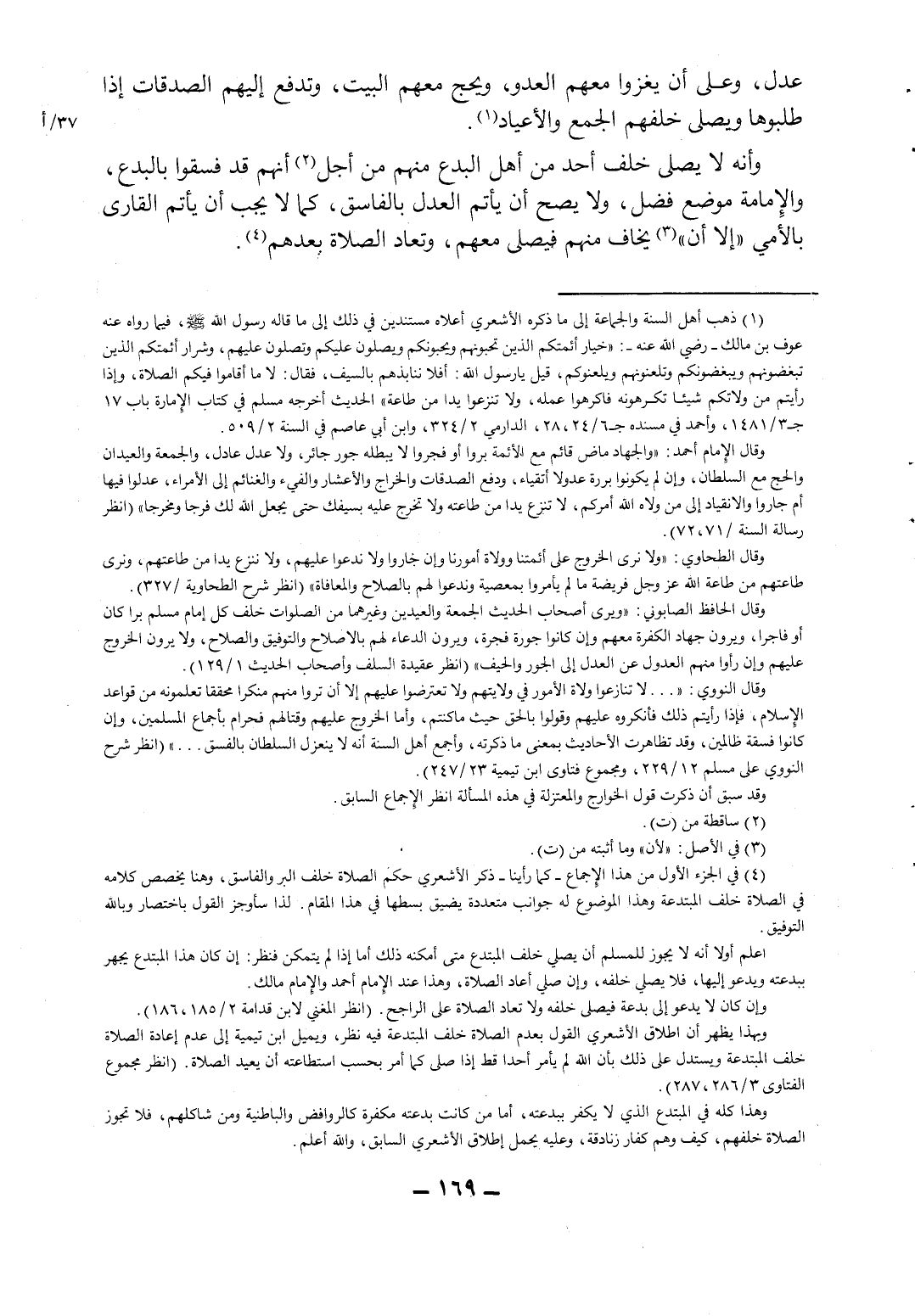 4 في الجزء الأول من هذا الإجماع - كما رأينا - ذكر الأشعري حكم الصلاة خلف البر والفاسق، وهنا يخصص كلامه في الصلاة خلف المبتدعة وهذا الموضوع له جوانب متعددة يضيق بسطها في هذا المقام. لذا سأوجز القول باختصار وبالله التوفيق.