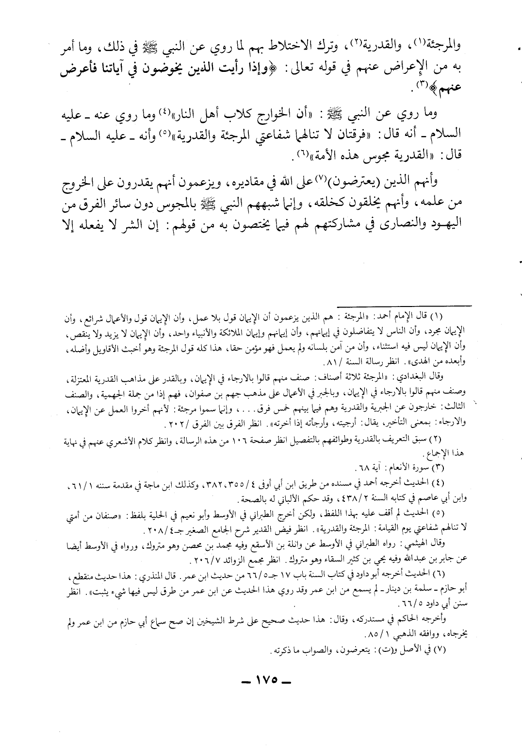 5 الحديث لم أقف عليه بهذا اللفظ، ولكن أخرج الطبراني في الأوسط وأبو نعيم في الحلية بلفظ: "صنفان من أمتي لا تنالهم شفاعتي يوم القيامة المرجئة والقدرية". انظر فيض القدير شرح الجامع الصغير 4/208.