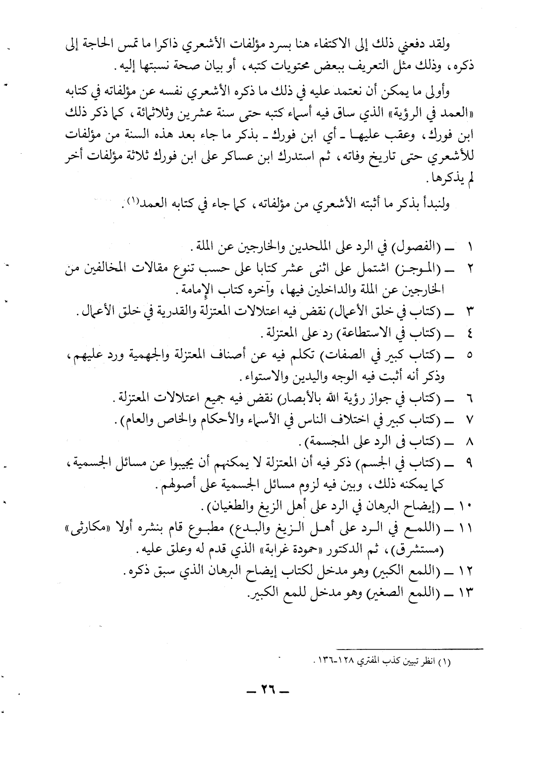 ولقد دفعني ذلك إلى الاكتفاء هنا بسرد مؤلفات الأشعري ذاكراً ما تمس الحاجة إلى ذكره، وذلك مثل التعريف ببعض محتويات كتبه، أو بيان صحة نسبتها إليه.