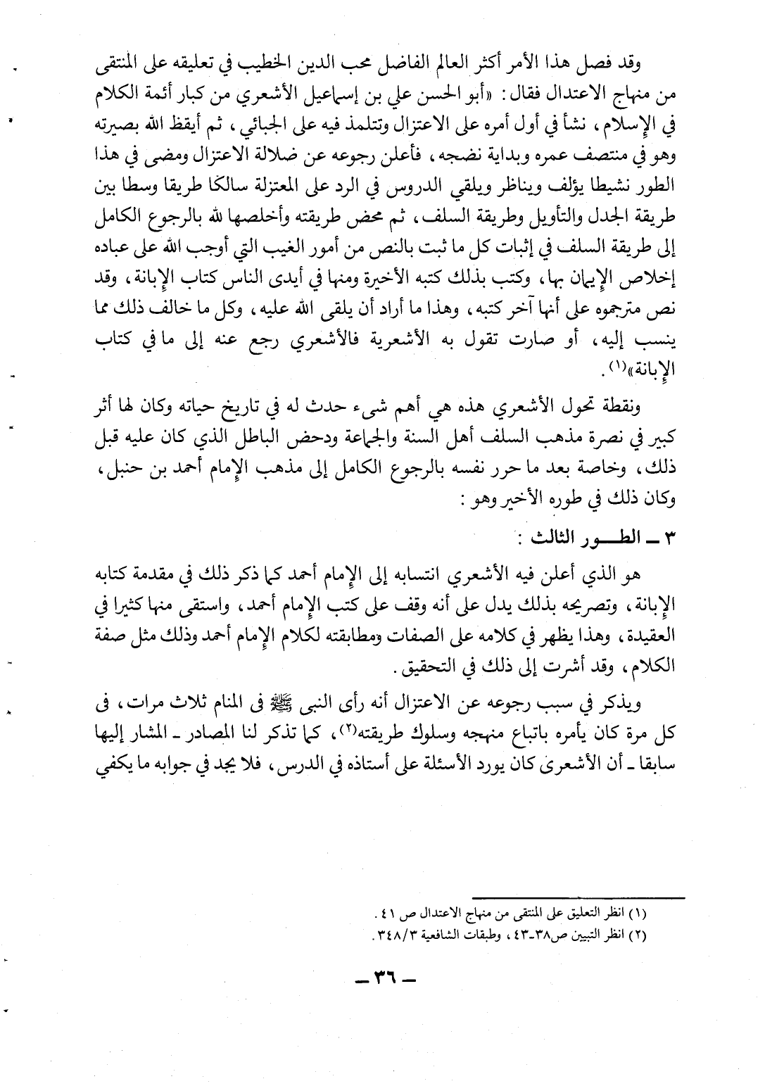 وقد فصل هذا الأمر أكثر العالم الفاضل محب الدين الخطيب في تعليقه على المنتقى من منهاج الاعتدال فقال: "أبو الحسن علي بن إسماعيل الأشعري من كبار أئمة الكلام في الإسلام، نشأ في أول أمره على الاعتزال وتتلمذ فيه على الجبائي، ثم أيقظ الله بصيرته وهو في منتصف عمره وبداية نضجه، فأعلن رجوعه عن ضلالة الاعتزال ومضى في هذا الطور نشيطاً يؤلف ويناظر ويلقي الدروس في الرد على المعتزلة سالكاً طريقاً وسطاً بين طريقة الجدل والتأويل وطريقة السلف، ثم مَحضّ طريقته وأخلصها لله بالرجوع الكامل إلى طريقة السلف في إثبات كل ما ثبت بالنص من أمور الغيب التي أوجب الله على عباده إخلاص الإيمان بها، وكتب بذلك كتبه الأخيرة ومنها في أيدي الناس كتاب الإبانة، وقد نص مترجموه على أنها آخر كتبه، وهذا ما أراد أن يلقى الله عليه، وكل ما خالف ذلك مما ينسب إليه، أو صارت تقول به الأشعرية فالأشعري رجع عنه إلى ما في كتاب الإبانة"1.