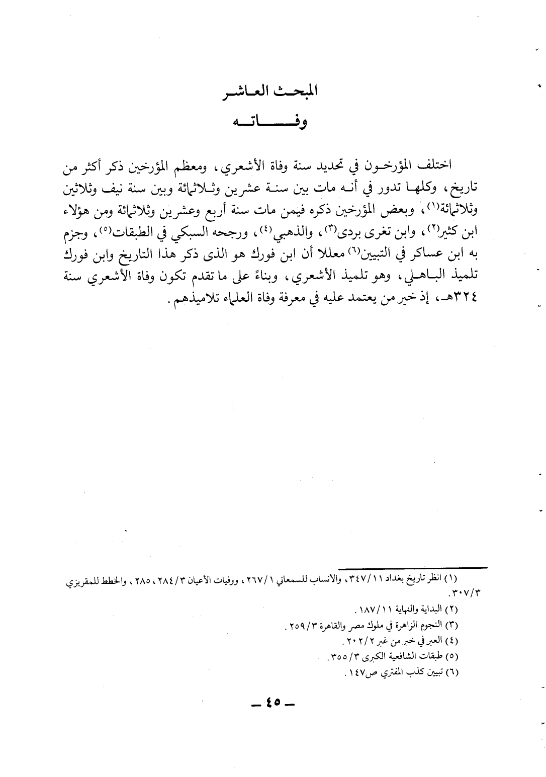 اختلف المؤرخون في تحديد سنة وفاة الأشعري، ومعظم المؤرخين ذكر أكثر من تاريخ، وكلها تدور في أنه مات بين سنة عشرين وثلاثمائة وبين سنة نيف وثلاثين وثلاثمائة1، وبعض المؤرخين ذكره فيمن مات سنة أربع وعشرين وثلاثمائة ومن هؤلاء ابن كثير2، وابن تغرى بردى3، والذهبي4، ورجحه السبكي في الطبقات5، وجزم به ابن عساكر في التبيين6 معللاً أن ابن فورك هو الذي ذكر هذا التاريخ وابن فورك تلميذ الباهلي، وهو تلميذ الأشعري، وبناءً على ما تقدم تكون وفاة الأشعري سنة 324هـ؛ إذ خير من يعتمد عليه في معرفة وفاة العلماء تلاميذهم.