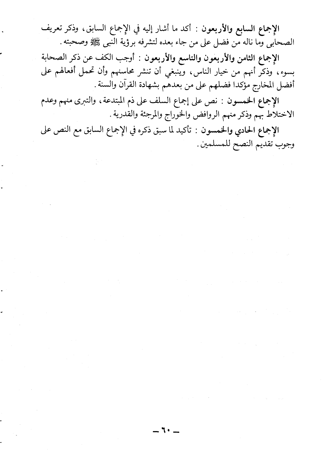 الإجماع الثامن والأربعون والتاسع والأربعون: أوجب الكف عن ذكر الصحابة بسوء، وذكر أنهم من خيار الناس، وينبغي أن تنشر محاسنهم وأن تحمل أفعالهم على أفضل المخارج مؤكداً فضلهم على من بعدهم بشهادة القرآن والسنة.