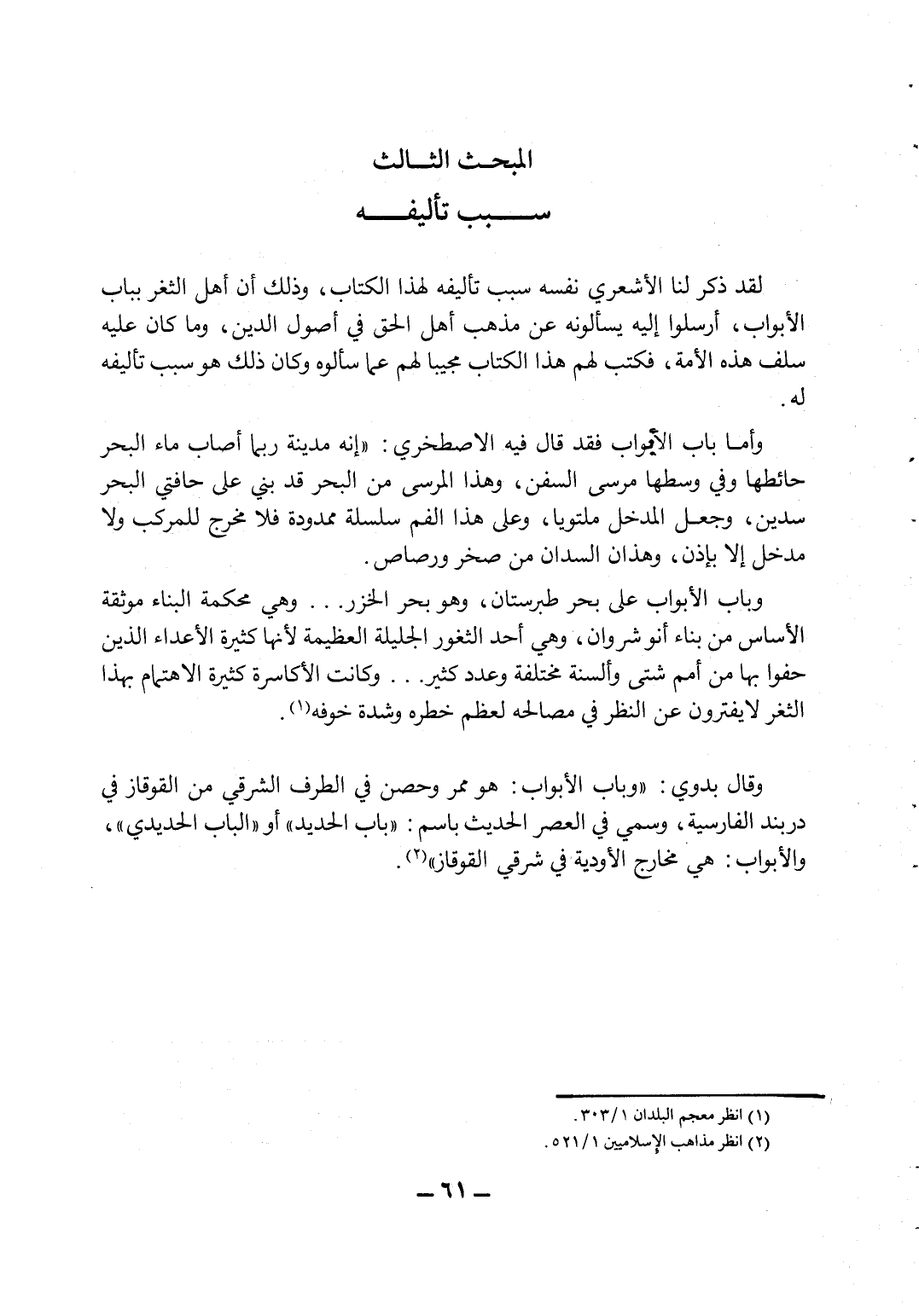 وقال بدوي: "باب الأبواب: هو ممر وحصن في الطرف الشرقي من القوقاز في دربند الفارسية، وسمي في العصر الحديث "باب الحديد" أو "الباب الحديدي"، والأبواب: هي مخارج الأودية في شرقي القوقاز"2.