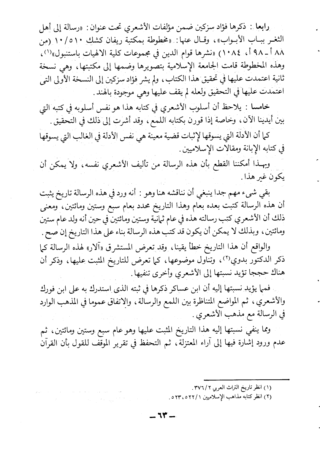 رابعاً: ذكرها فؤاد سزكين ضمن مؤلفات الأشعري تحت عنوان: "رسالة إلى أهل الثغر بباب الأبواب"، وقال عنها: "مخطوطة بمكتبة ريفان كشك 510/10 (من 88 أ - 98 أ، 1084) "نشرها قوام الدين في مجموعات الكلية الإلهيات باستنبول"1، وهذه المخطوطة قامت الجامعة الإسلامية بتصويرها وضمها إلى مكتبتها، وهي نسخة ثانية اعتمدت عليها في تحقيق هذا الكتاب، ولم يشر فؤاد سزكين إلى النسخة الأولى التي اعتمدت عليها في التحقيق ولعله لم يقف عليها وهي موجودة بالهند.