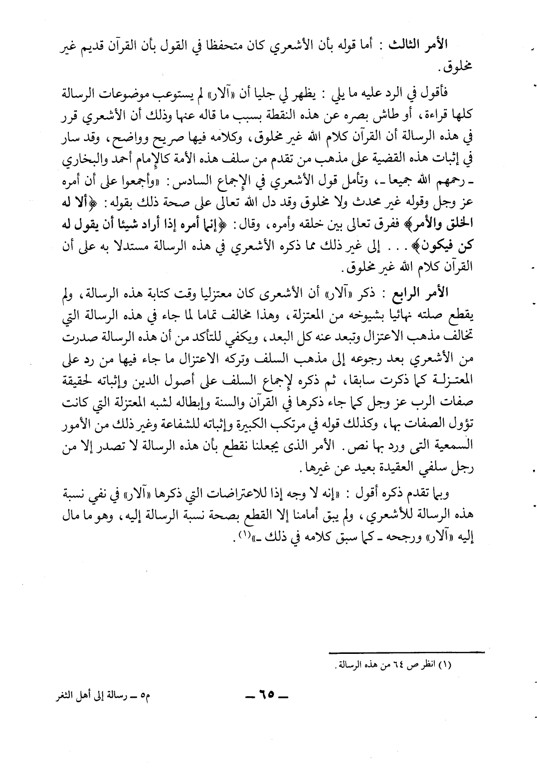 فأقول في الرد عليه ما يلي: يظهر لي جلياً بأن "آلار" لم يستوعب موضوعات الرسالة كلها قراءة، أو طاش بصره عن هذه النقطة بسبب ما قاله عنها وذلك أن الأشعري قرر في هذه الرسالة أن القرآن كلام الله غير مخلوق، وكلامه فيها صريح وواضح، وقد سار في إثبات هذه القضية على مذهب من تقدم من سلف هذه الأمة كالإمام أحمد والبخاري رحمهم الله جميعاً، وتأمل قول الأشعري في الإجماع السادس: "وأجمعوا على أنّ أمره عز وجل وقوله غير محدث ولا مخلوق وقد دل الله تعالى على صحة ذلك بقوله: {أَلا لَهُ الْخَلْقُ وَالأَمْرُ} ففرق تعالى بين خلقه وأمره، وقال: {إِنَّمَا أَمْرُهُ إِذَا أَرَادَ شَيْئاً أَنْ يَقُولَ لَهُ كُنْ فَيَكُونُ} "… إلى غير ذلك مما ذكره الأشعري في هذه الرسالة مستدلاً به على أن القرآن كلام الله غير مخلوق.