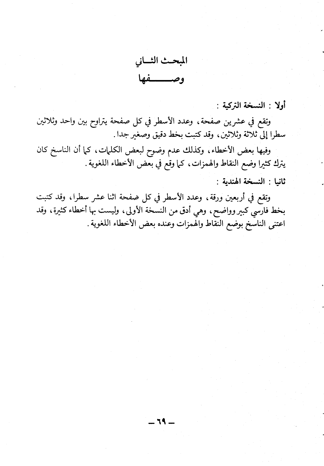 وتقع في أربعين ورقة، وعدد الأسطر في كل صفحة اثنا عشر سطراً، وقد كتبت بخط فارسي كبير وواضح، وهي أدق من النسخة الأولى، وليس بها أخطاء كثيرة، وقد اعتنى الناسخ بوضع النقاط والهمزات وعنده بعض الأخطاء اللغوية.