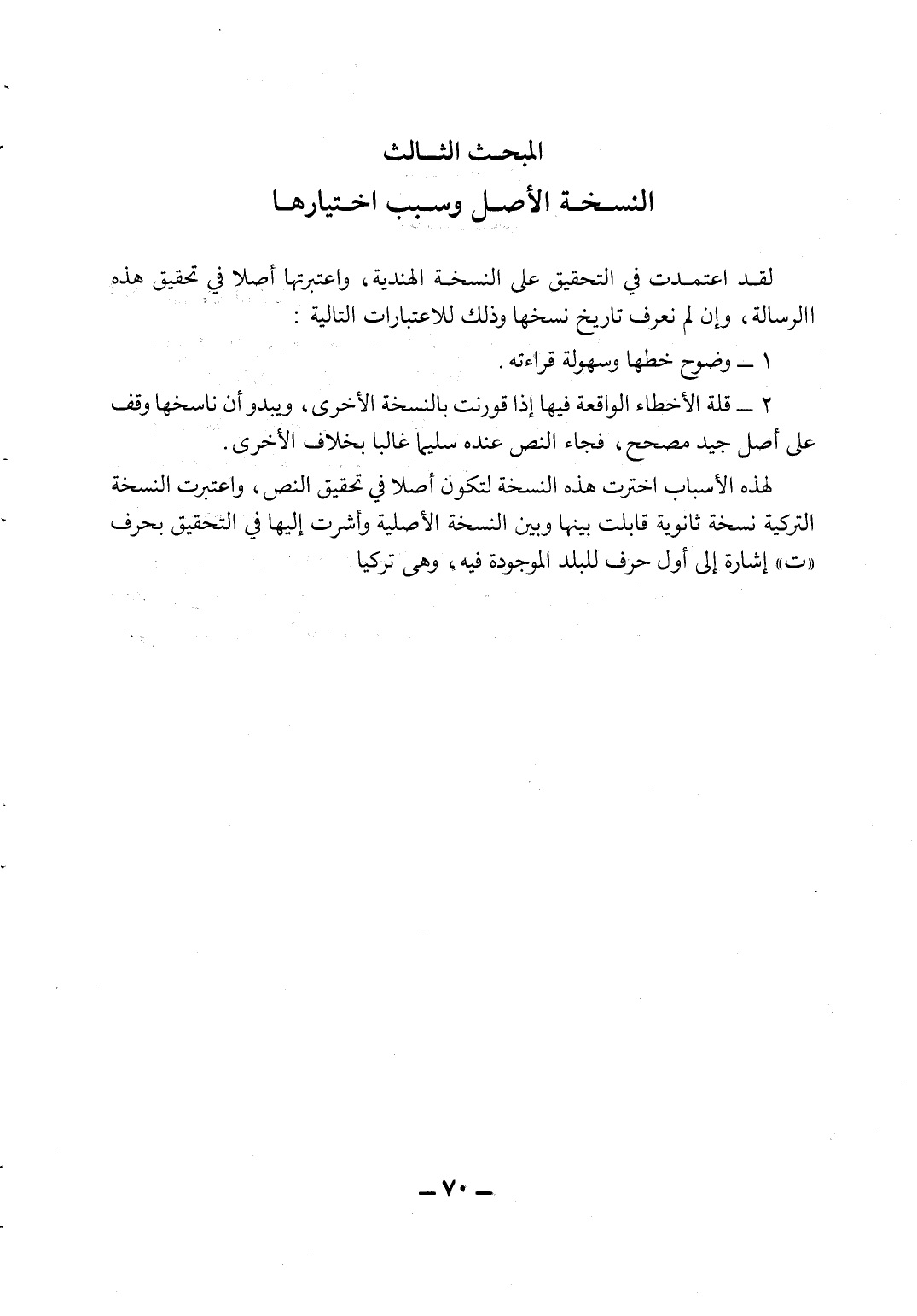 ولهذه الأسباب اخترت هذه النسخة لتكون أصلاً في تحقيق النص، واعتبرت النسخة التركية نسخة ثانوية قابلت بينها وبين النسخة الأصلية وأشرت إليها في التحقيق بحرف "ت" إشارة إلى أول حرف للبلد الموجودة فيه، وهي تركيا.