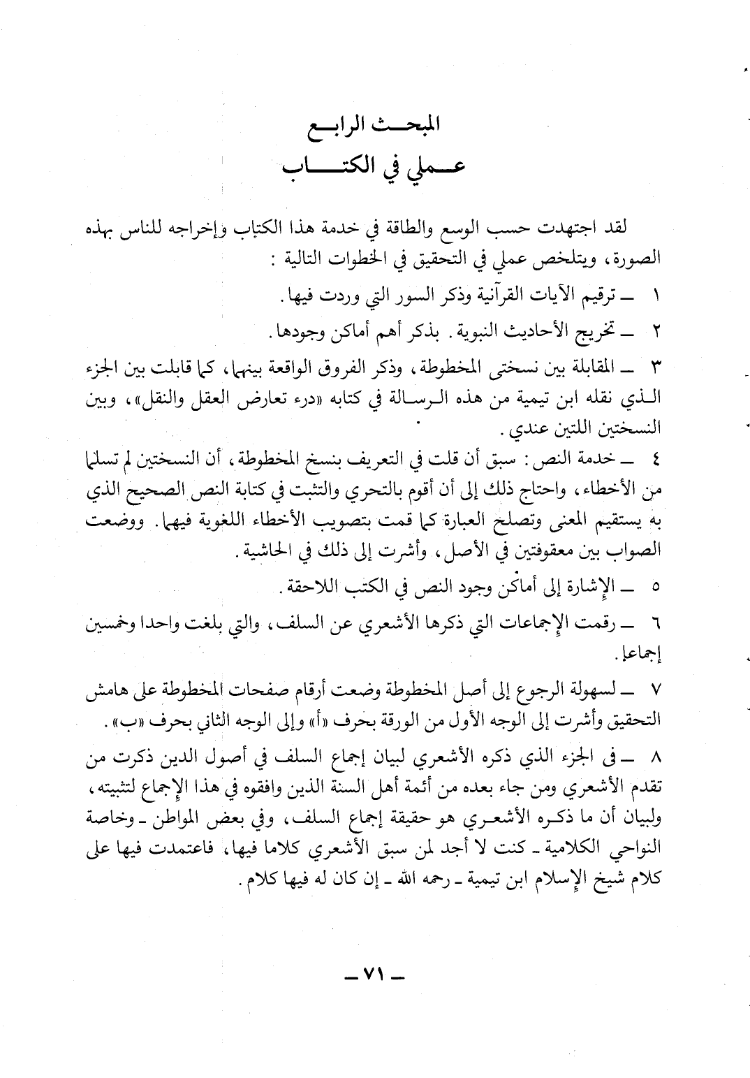 8- في الجزء الذي ذكره الأشعري لبيان إجماع السلف في أصول الدين ذكرت من تقدم الأشعري ومن جاء بعده من أئمة أهل السنة الذين وافقوه في هذا الإجماع لتثبيته، ولبيان أن ما ذكره الأشعري هو حقيقة إجماع السلف، وفي بعض المواطن - وخاصة النواحي الكلامية - كنت لا أجد لمن سبق الأشعري كلاماً فيها، فاعتمدت فيها على كلام شيخ الإسلام ابن تيمية - رحمه الله - إن كان له فيها كلام.